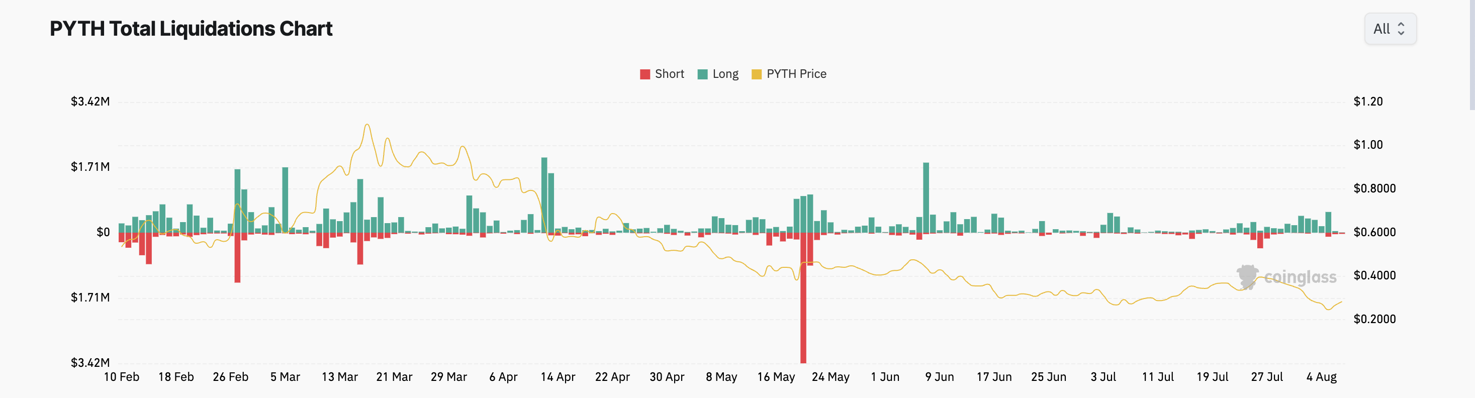 Hơn nữa, do giá của PYTH giảm hai con số trong tuần qua, nhiều vị thế Long đã bị thanh lý. Theo Coinglass, tổng giá trị thanh lý các lệnh Long của PYTH đã vượt quá 1.8 triệu USD trong 7 ngày qua.