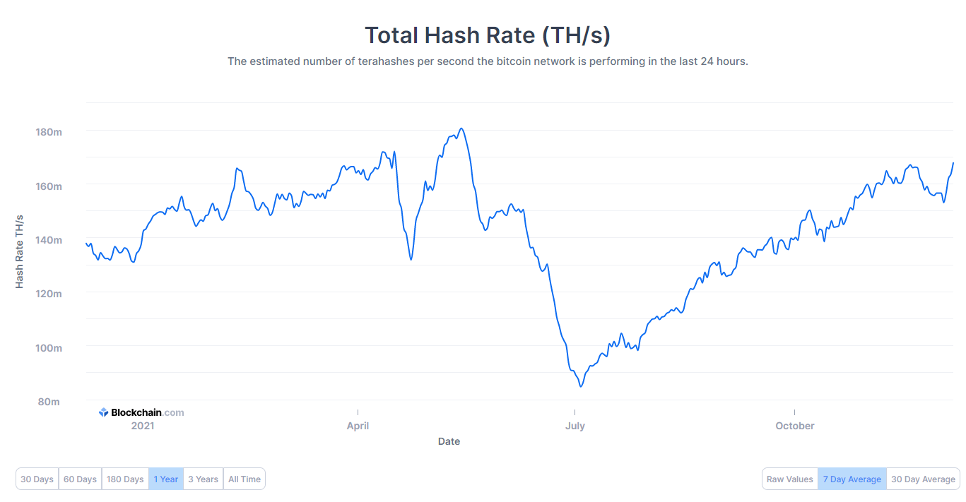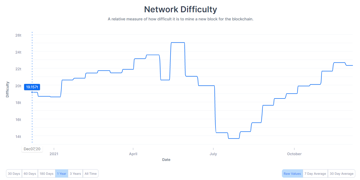 Vào thời điểm tháng 7/2021, khi Trung Quốc ban hành lệnh cấm các thợ đào (miner) khai thác BTC tại quốc gia này, một lượng lớn thợ đào đã phải tháo chạy khỏi Trung Quốc. Điều này dẫn đến hệ lụy là hash rate của mạng lưới Bitcoin bị sụt giảm nghiêm trọng, xuống 84.79 triệu TH/s (theo blockchain.com). Hash rate giảm kéo theo đó độ khó khai thác của mạng lưới cũng được điều chỉnh xuống. Tại thời điểm cuối tháng 7/2021, độ khó được điều chỉnh xuống mức 13.673t.