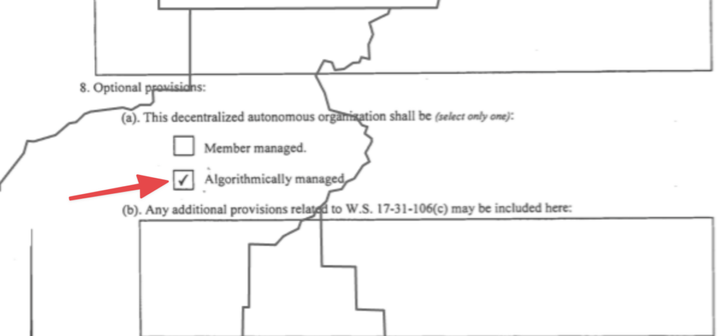 Trong văn bản pháp lý đã xác định người quản lý các khu vực này là “quản lý bằng thuật toán”. Đây là đặc tính cơ bản của bất kỳ một DAO nào, được quản lý một cách phi tập trung. Văn bản pháp lý này cho thấy một sự tiến bộ vượt bậc cho sự chấp nhận về một thế giới phi tập trung.