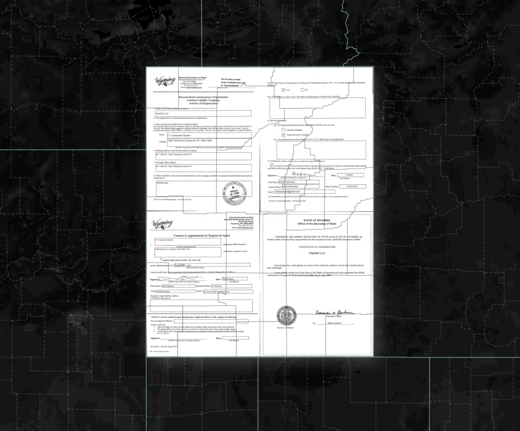Dự án sở hữu một mảnh đất ở Wyoming. Luật Wyoming DAO LLC mới tạo điều kiện cho việc thử nhiệm và phát triển những khu vực tự trị quản lý phi tập trung. Luật pháp bảo vệ hợp pháp việc tạo ra các DAO bằng cách cung cấp cho chúng tình trạng pháp lý ngang bằng với một cá nhân hoặc pháp nhân.