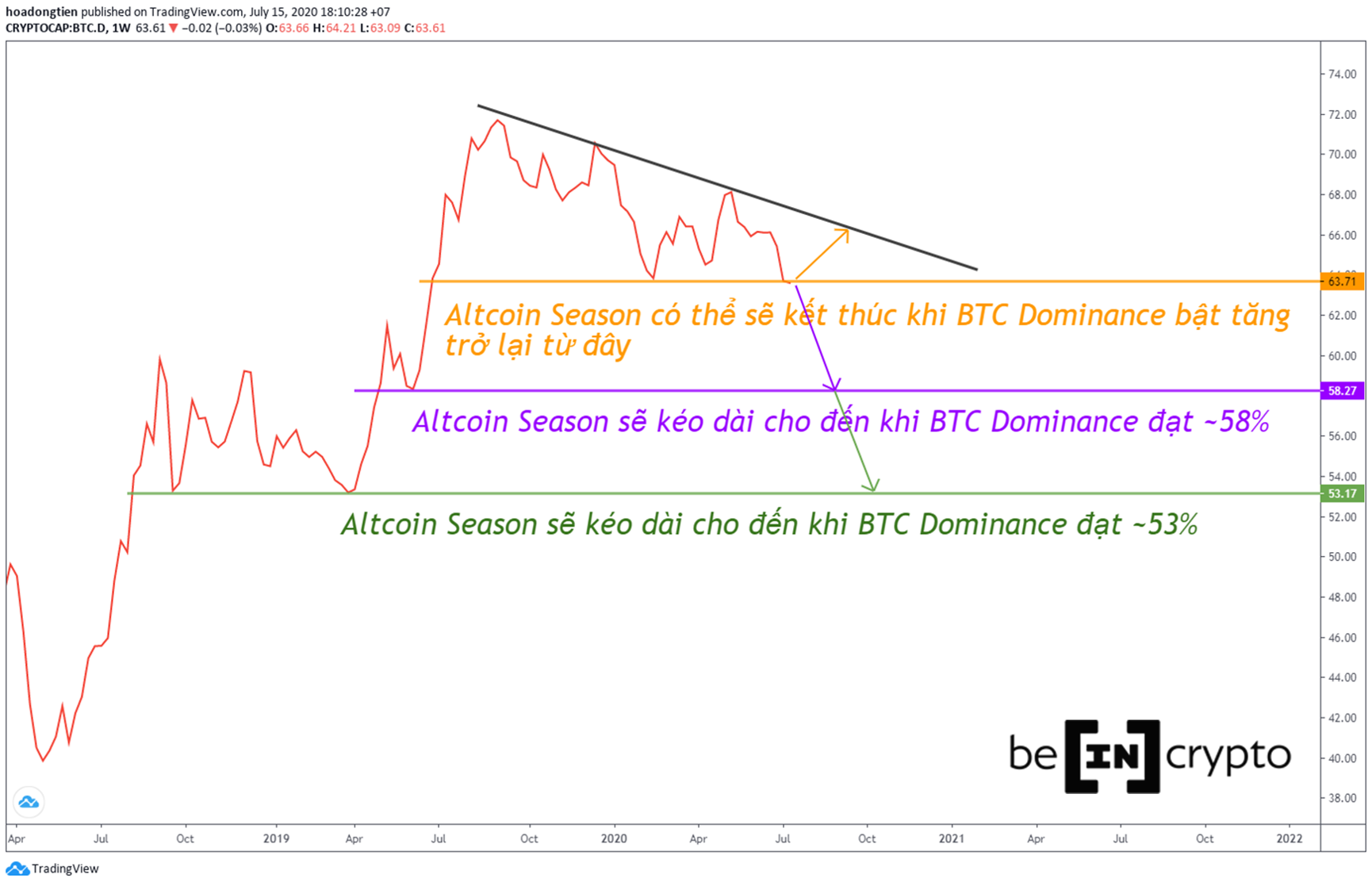 Hiện tại, có thể thấy đồ thị Bitcoin Dominance đi trong một mô hình tam giác giảm. Thế nhưng biến động đã chạm đến cạnh dưới của tam giác giảm này. Nghĩa là đã chạm đến vùng hỗ trợ khoảng 62~63%. Khả năng bật tăng trở lại từ đây là hoàn toàn có thể. Tuy nhiên, cũng cần lưu ý thêm kịch bản: