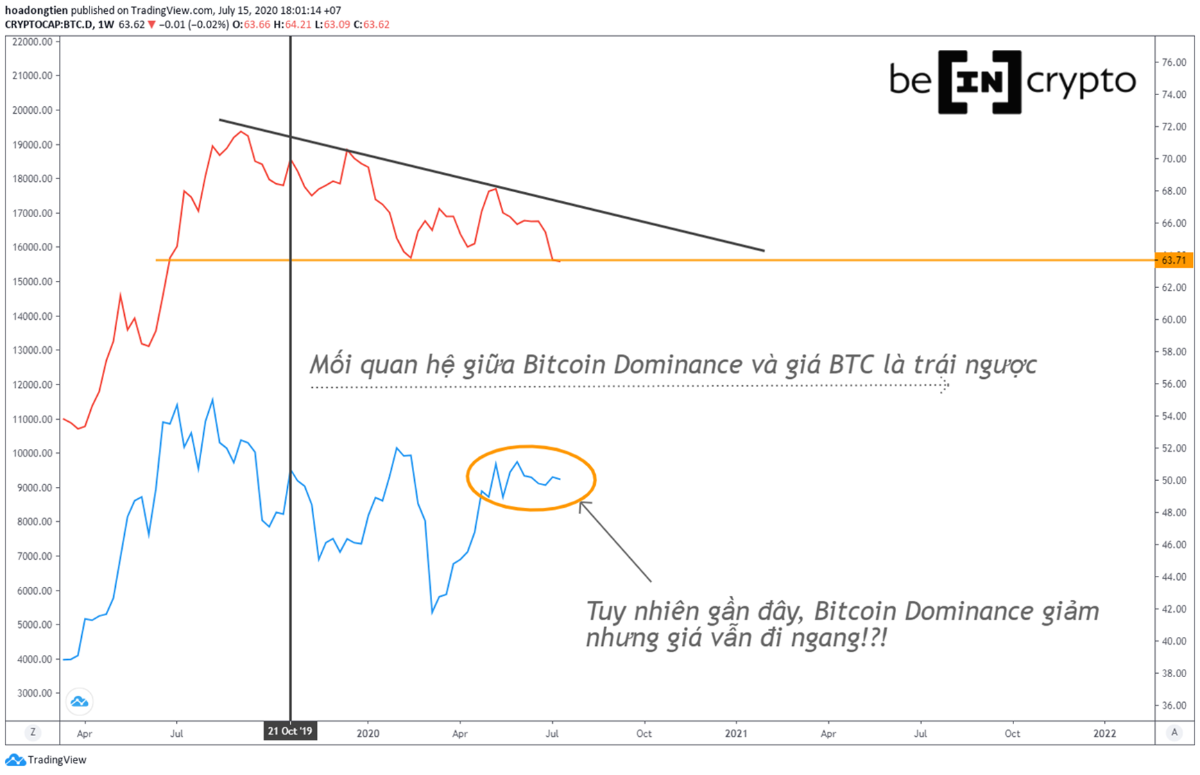 Kể từ cuối năm 2019, chúng ta nhìn thấy rõ mối liên hệ trái ngược giữa Bitcoin Dominance và giá BTC. Nhưng thời gian gần đây, dù BTC Dominance giảm nhưng giá BTC không thể hiện mức nào tăng nào đáng kể.