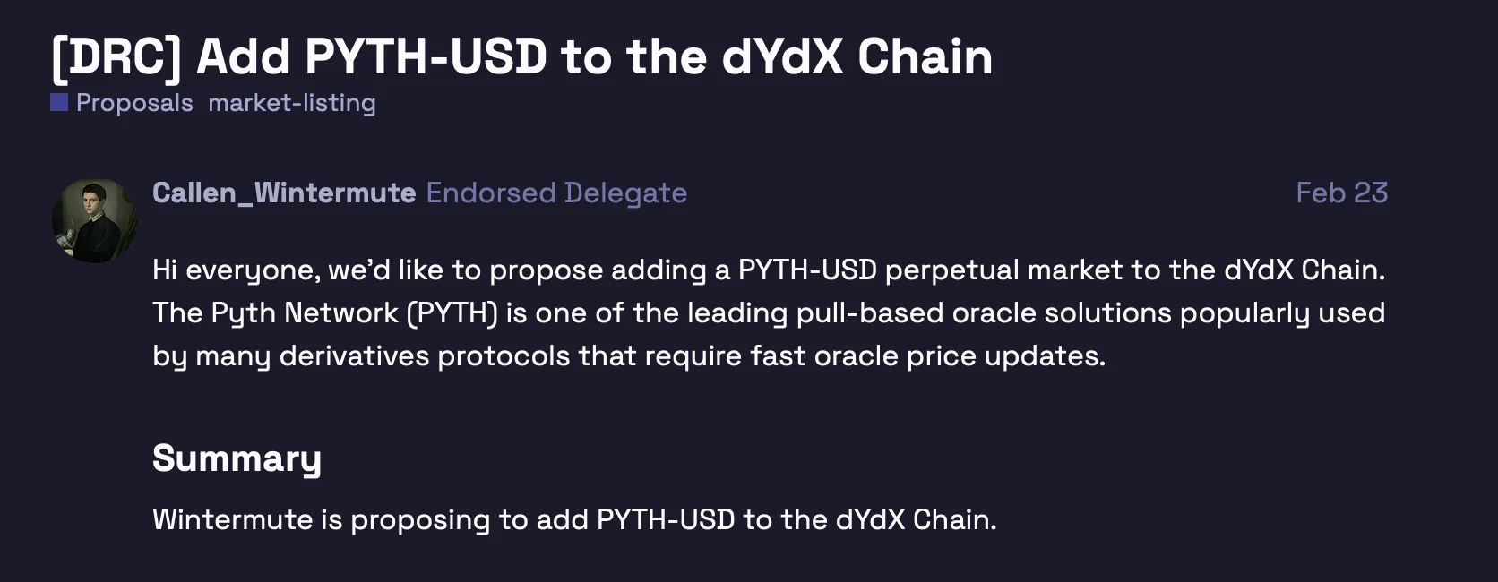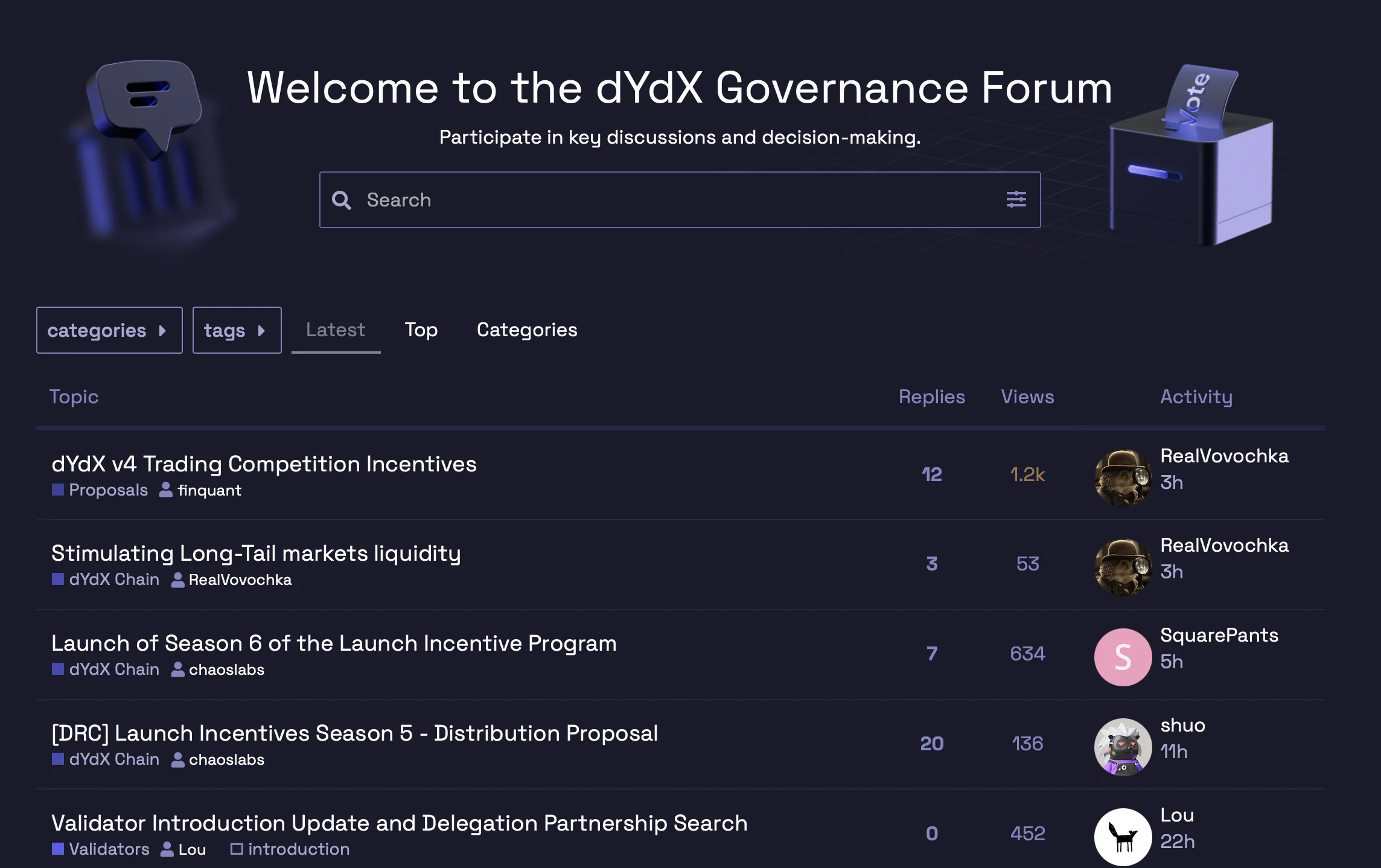 - Hầu hết các đề xuất đều được đăng trên Diễn đàn dYdX, nơi các thành viên cộng đồng có thể đưa ra phản hồi và tham gia thảo luận. Nền tảng này hỗ trợ đối thoại cởi mở, cho phép người dùng chia sẻ quan điểm và hiểu biết của họ. Diễn đàn hoạt động như một trung tâm gắn kết cộng đồng, đảm bảo rằng mọi người đều có tiếng nói trong quá trình quản trị.