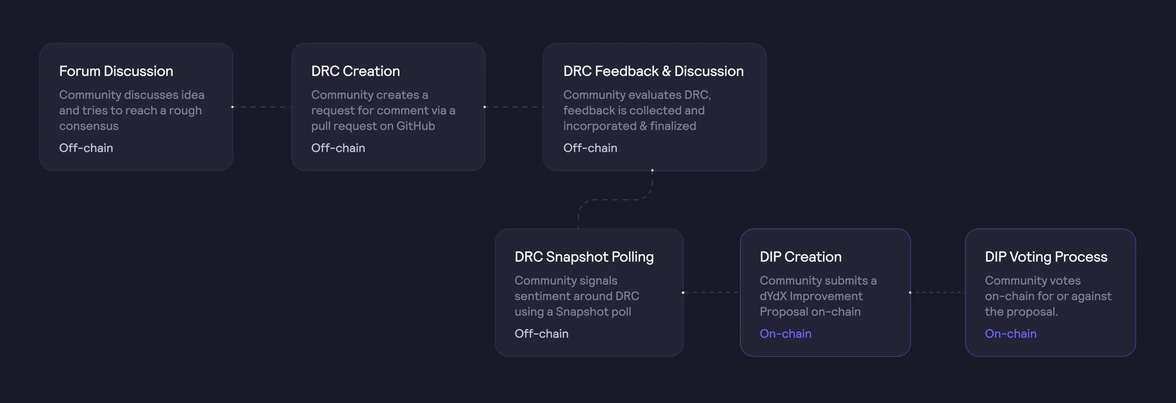 Quá trình này rất đơn giản: Chủ sở hữu mã thông báo DYDX đề xuất các thay đổi bằng cách gửi mã thông báo DYDX chưa đặt cọc. Họ phải đáp ứng tỷ lệ tiền gửi ban đầu tối thiểu, hiện được đặt ở mức 20% hoặc 400 DYDX chưa đặt cọc. Một cuộc bỏ phiếu sẽ chỉ được diễn ra khi đạt được số tiền gửi tối thiểu là 2,000 DYDX chưa đặt cọc. Nếu một đề xuất không đáp ứng số tiền gửi tối thiểu, những người nắm giữ mã thông báo khác có thể hỗ trợ đề xuất đó bằng cách cam kết bổ sung các mã thông báo DYDX chưa đặt cọc.