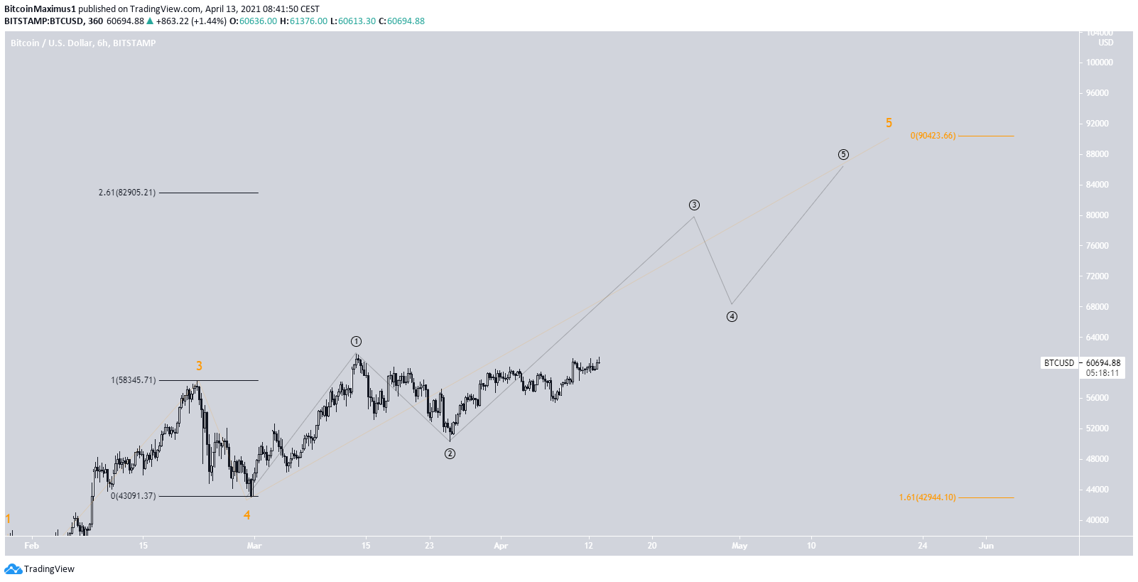 Số lượng sóng cho thấy BTC đang ở trong sóng năm (màu trắng) của một xung động tăng giá dài hạn.
