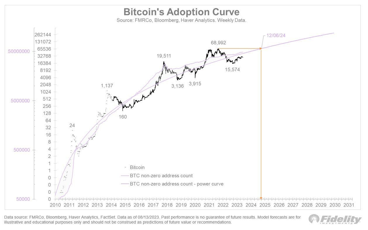 Những mô hình phân tích giá Bitcoin của Fidelity thường liên tục dự đoán khả năng BTC lập đỉnh mới. Nhà phân tích từ Fidelity sử dụng mô hình đường cong chấp nhận Bitcoin và dự đoán giá BTC có thể trở lại ATH vào giữa năm 2024.
