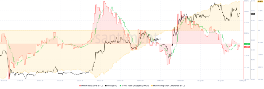 Tỷ lệ MVRV trong 30 ngày (màu đỏ) đã trở lại dưới 0%, có nghĩa là trung bình người giao dịch trong 30 ngày qua lại giảm. Khi điều này xảy ra, rủi ro sẽ thấp hơn mức trung bình khi tham gia vào tiền điện tử.