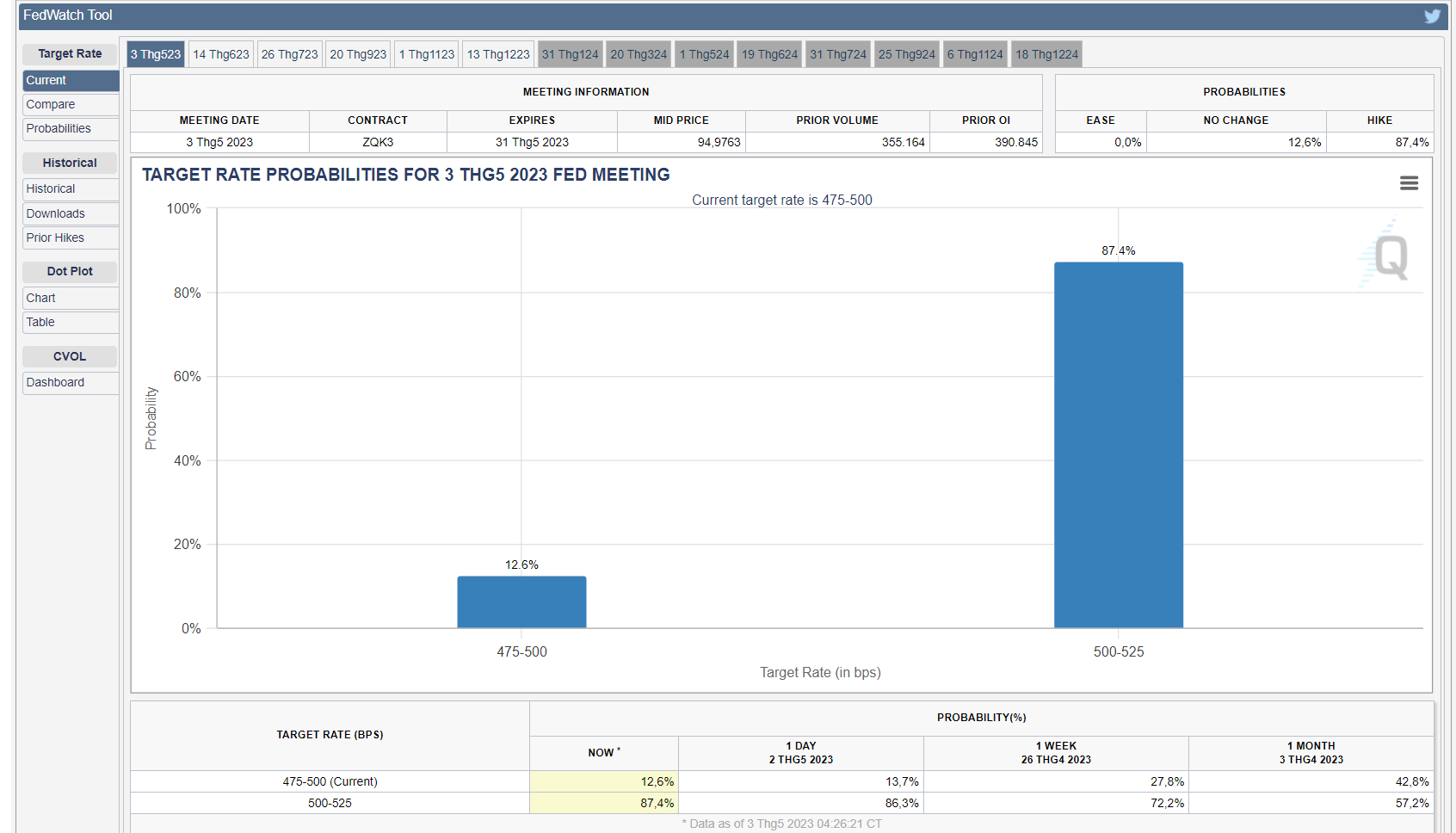 Theo dữ liệu từ CME FedWatch, có 87.4% nhà đầu tư tin vào Fed sẽ tăng thêm 0.25% và 12.6% tin rằng Fed sẽ không tăng lãi suất, tính đến thời điểm viết bài.