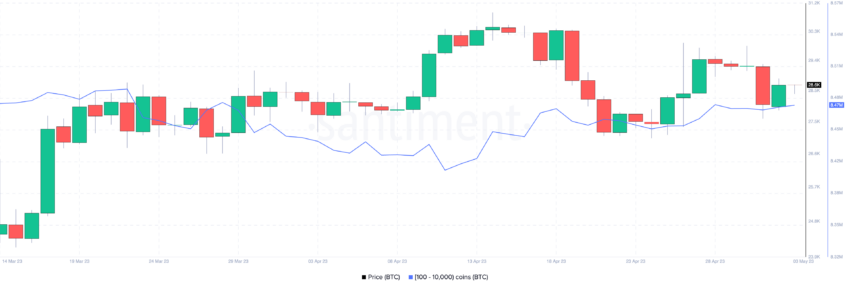 SponsoredCá mập và cá voi bitcoin, nắm giữ từ 100 đến 10,000 BTC, đã tích lũy trở lại khi nhóm này bắt đầu bán tháo vào cuối tháng 3.