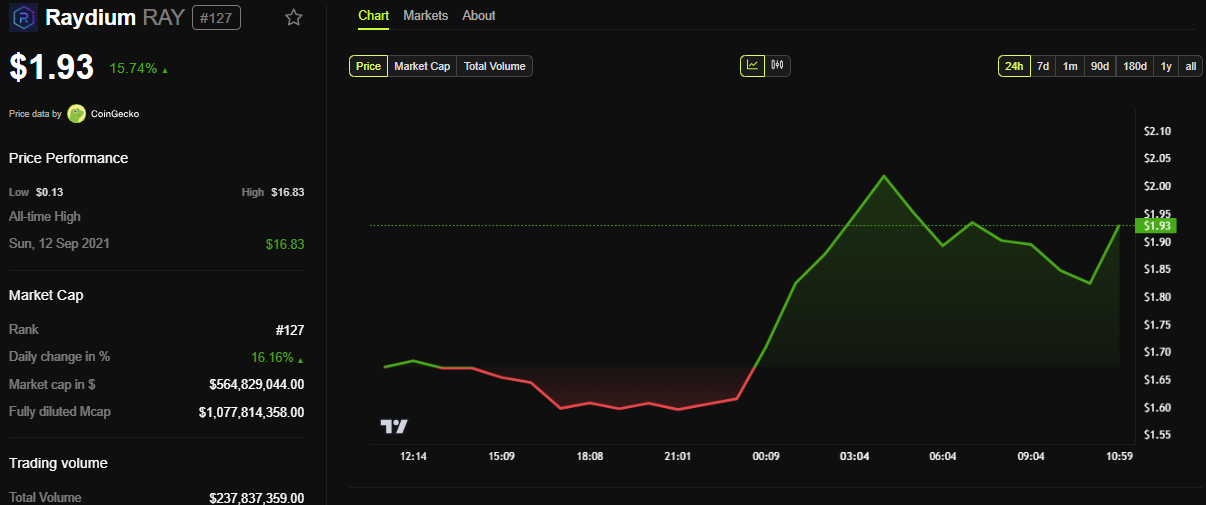 Token gốc của Raydium, RAY, đã tăng mạnh trong những giờ đầu của phiên giao dịch châu Á. Sự tăng giá này diễn ra sau khi sàn giao dịch phi tập trung (DEX) và nhà tạo lập thị trường tự động (AMM) trên nền tảng Solana công bố kế hoạch cho bệ phóng token của mình, LaunchLab.