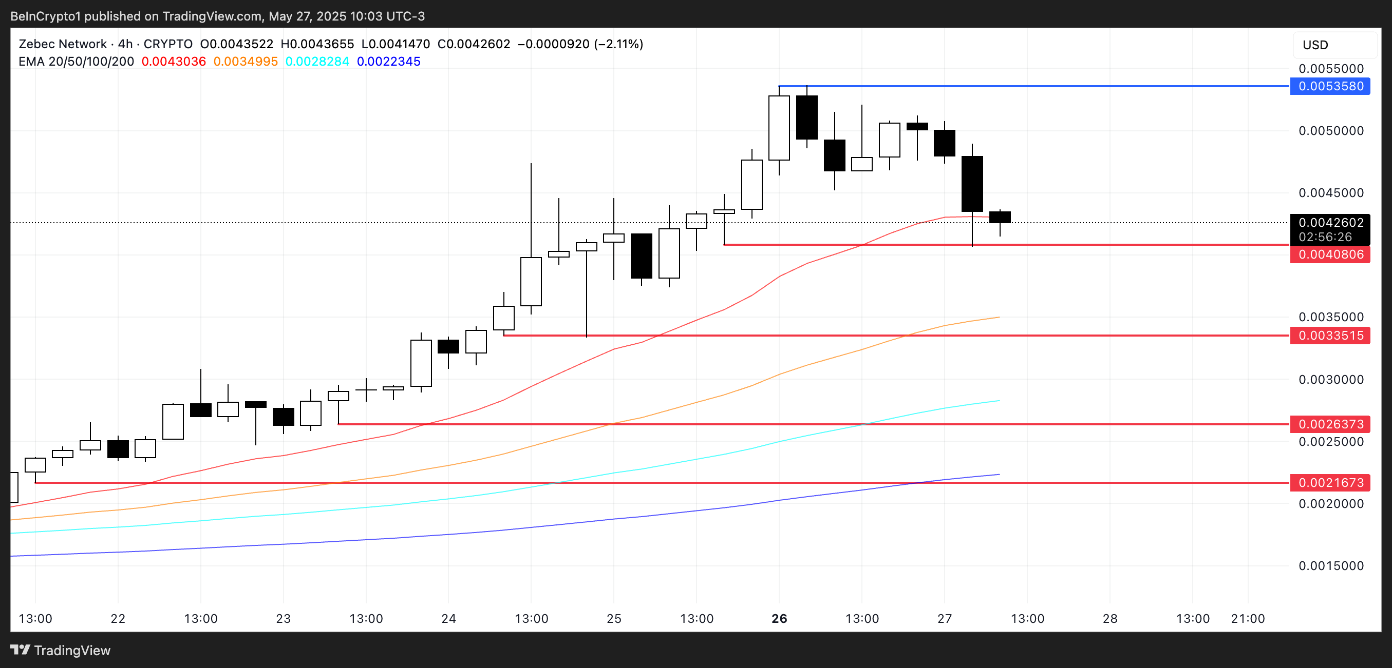 Token hiện đang dao động gần một mức hỗ trợ quan trọng tại 0.0040 USD. Nếu mức này không giữ được, ZBCN có thể kéo dài sự điều chỉnh xuống 0.00335 USD. Một xu hướng giảm kéo dài có thể đẩy nó xuống thấp hơn nữa, với các mức hỗ trợ bổ sung tại 0.0026 USD và 0.00216 USD.