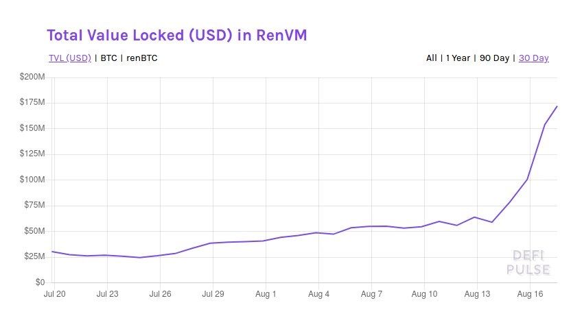 RenBTC của dự án Ren cũng đang chứng kiến mức tăng trưởng gần 200% trong chưa đến một tuần. Theo dữ liệu từ DeFi Pulse, renBTC đã tăng từ 59 triệu USD lên 176 triệu về giá trị BTC được khóa trong trên blockchain Ethereum kể từ 13/8.