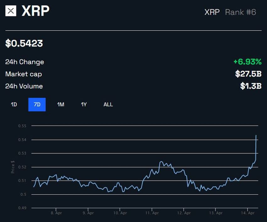 Mã thông báo gốc của Ripple, XRP đã tăng gần 7% trong ngày. Do đó, XRP đã giao dịch với giá 0.542 USD tại thời điểm viết bài. Hơn nữa, mã thông báo thanh toán xuyên biên giới đã tăng 44% trong tháng qua.