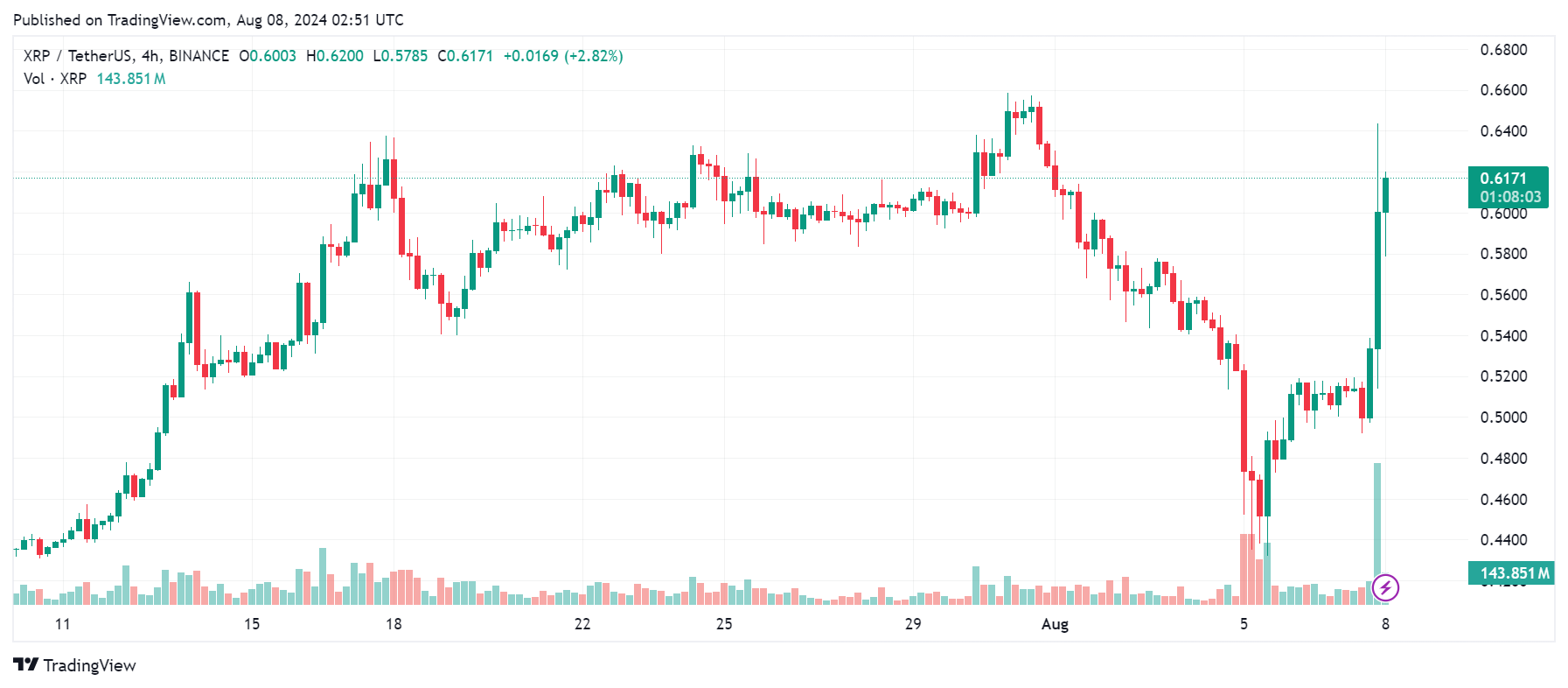 Sau quyết định của tòa án, giá XRP đã tăng đáng kể. Nó đã tăng từ 0.5018 USD lên 0.6373 USD, tăng 27% chỉ trong một tiếng rưỡi. Tại thời điểm viết bài, giá XRP đã ổn định và hiện đang giao dịch ở mức 0.6171 USD.