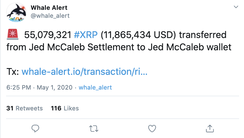 Ngoài mở khóa hàng tháng, một đồng sáng lập của Ripple cũng nhận được một khoản XRP của mình. Jed McCaleb đã được trao 55 triệu XRP vào ngày hôm qua, cũng là một phần thanh toán cho ông.
