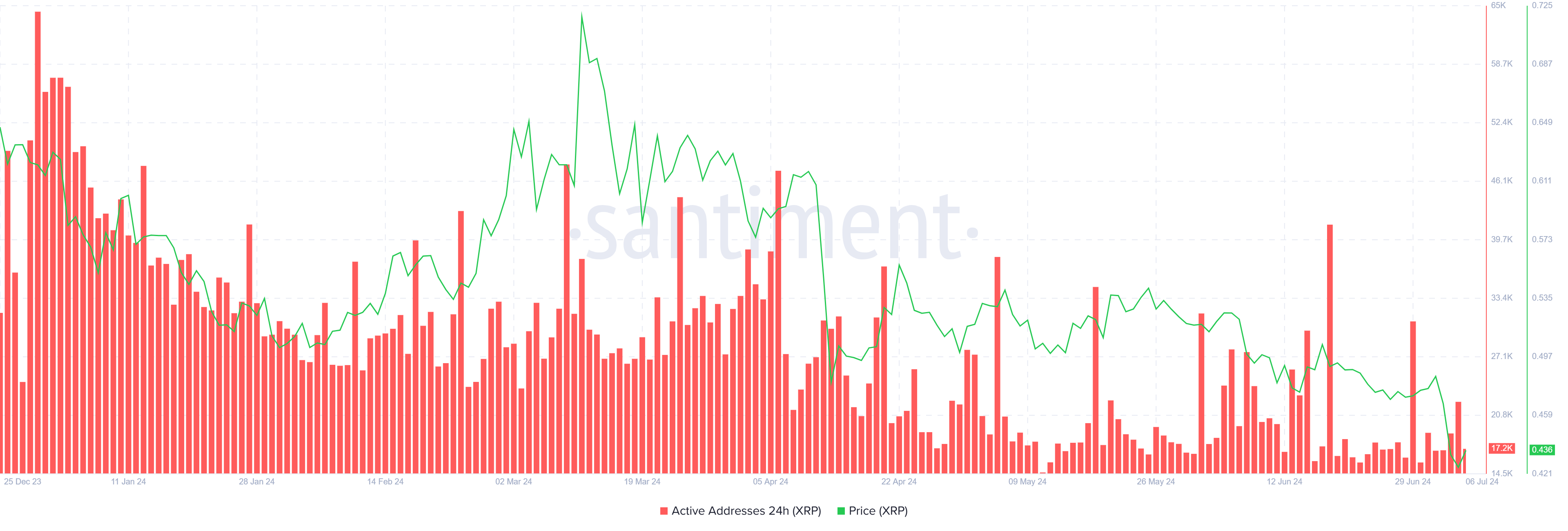 Giá XRP chắc chắn sẽ bị ảnh hưởng bởi cả nỗ lực và sự thiếu tham gia của các nhà đầu tư. Sự hiện diện của các nhà đầu tư XRP vẫn yếu, ảnh hưởng đến khả năng phục hồi. Mức độ tham gia thấp là rõ ràng, với số địa chỉ hoạt động trung bình dưới 20,000 mỗi ngày. Sự thiếu hoạt động này cho thấy sự giảm trong giao dịch ngắn hạn và lo ngại về việc chịu lỗ.