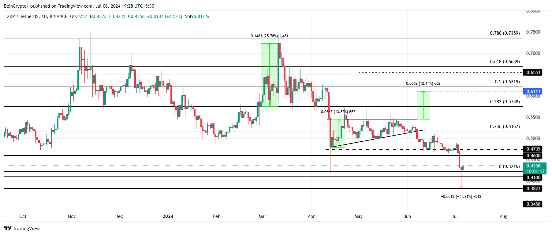 Nhưng nếu các dấu hiệu giảm giá tiếp tục chiếm ưu thế, giá XRP có thể mất điểm hỗ trợ quan trọng là 0.41 USD một lần nữa. Điều này sẽ làm mất hiệu lực của luận điểm trung lập-tích cực, dẫn đến sự sụt giảm thêm.