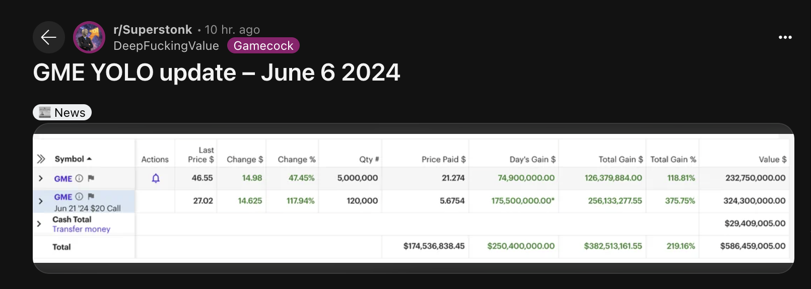 Kết quả đáng kinh ngạc này vốn bắt đầu tích lũy đà vào ngày 02/06. Vào ngày đó, Gill tiết lộ trên Reddit — Bài đăng đầu tiên của anh kể từ tháng 4/2021—rằng giá trị danh nghĩa của cổ phiếu và các tùy chọn mua GME của anh đã vượt quá 180 triệu USD.