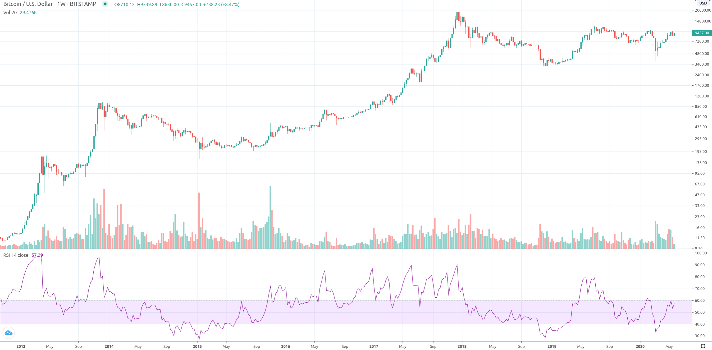 Chỉ số RSI của Bitcoin đã tăng trên khu vực 60 nhiều lần trong đợt tăng giá lên 2.000% của năm 2017. Điều đó cho thấy, đây là một chỉ số quan trọng với xu hướng giá BTC bây giờ.