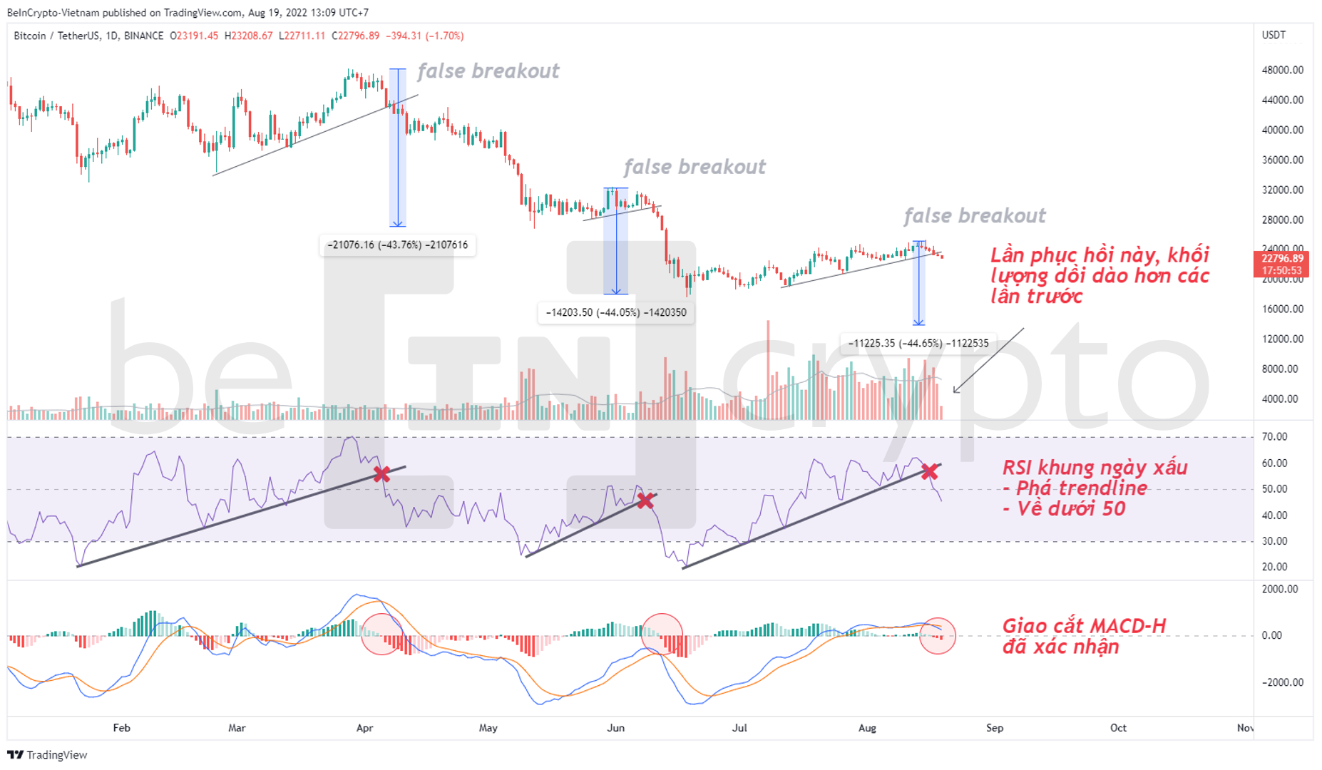 - Những lần giảm này đều được chỉ báo RSI và MACD-H xác nhận. Cụ thể, RSI khung 1D sẽ phá khỏi trendline và giao cắt MACD-H được xác nhận. RSI có thêm một tín hiệu xấu là về dưới mức trung bình 50. RSI với ý nghĩa là chỉ số sức mạnh tương đối, nên khi về dưới 50 thì nó muốn nói rằng sức mạnh bên bán đang lớn dần.