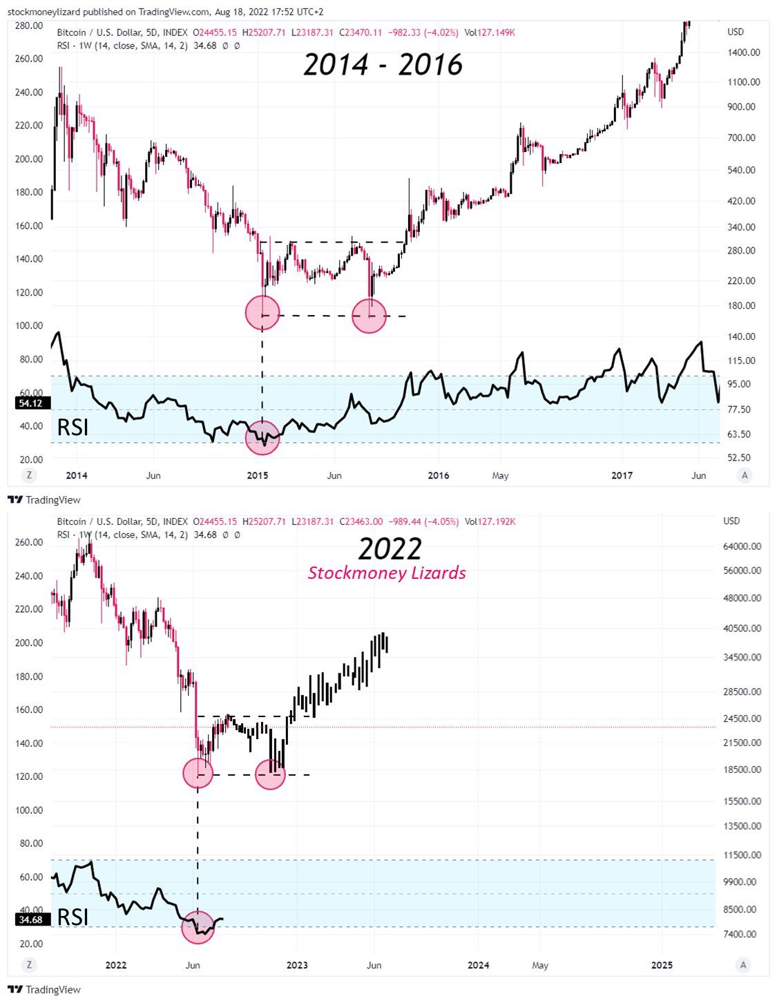 Quan sát của @StockmoneyL cho rằng Bitcoin dù có giảm mạnh cũng khó thể lập đáy sâu hơn đáy trước đó. Lập luận của nhận định này dựa trên cách giá Bitcoin biến động mùa downtrend 2014 – 2016.