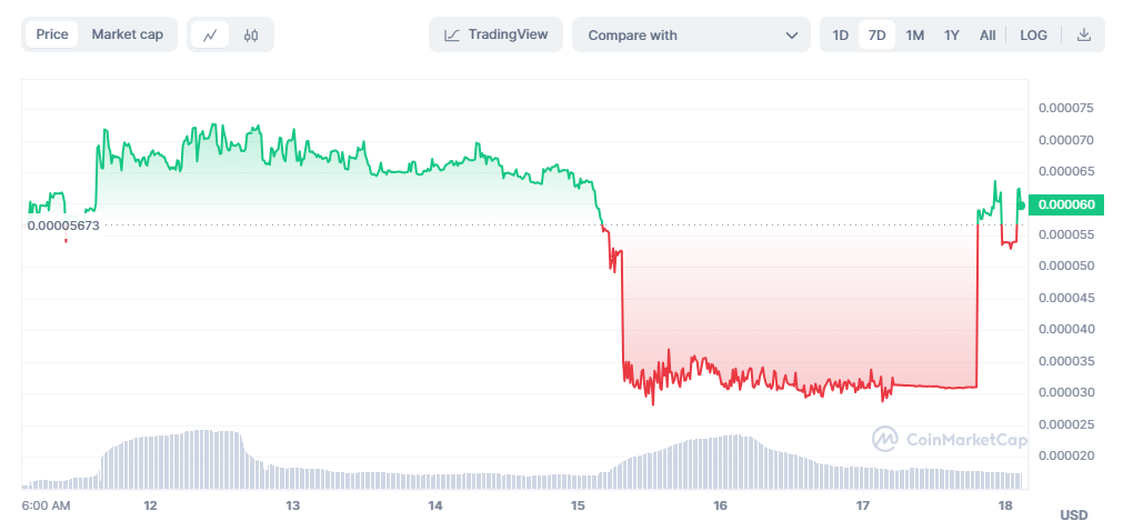 Sau tuyên bố Safemoon phá sản, như thường lệ thường thấy tại các dự án khác, giá trị của token SFM (token phiên bản Safemoon V2) ngay lập tự giảm mạnh xuống mức thấp kỷ lục. Theo ghi nhận của BeInCrypto, đợt bán tháo mạnh đã khiến giá SFM thời điểm đó đã rơi xuống mức thấp nhất tại 0.00002818 USD. Giá sau đó được giữ ở mức thấp này trong một thời gian ngắn trước khi chứng kiến một đợt phục hồi ấn tượng.