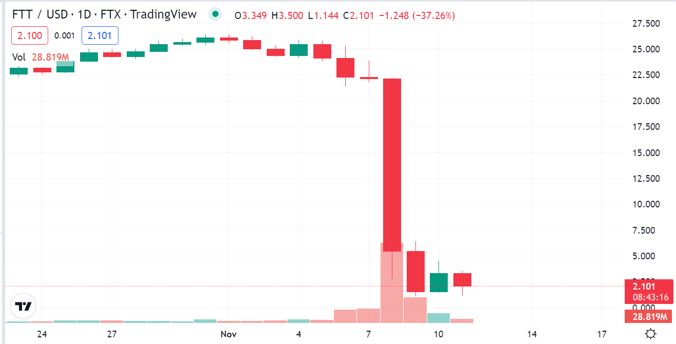 Token của FTX là FTT đã mất gần 90% giá trị kể từ ngày 7 tháng 11 năm 2022. Giá đang giao dịch ở mức 2.34 USD tại thời điểm viết bài.