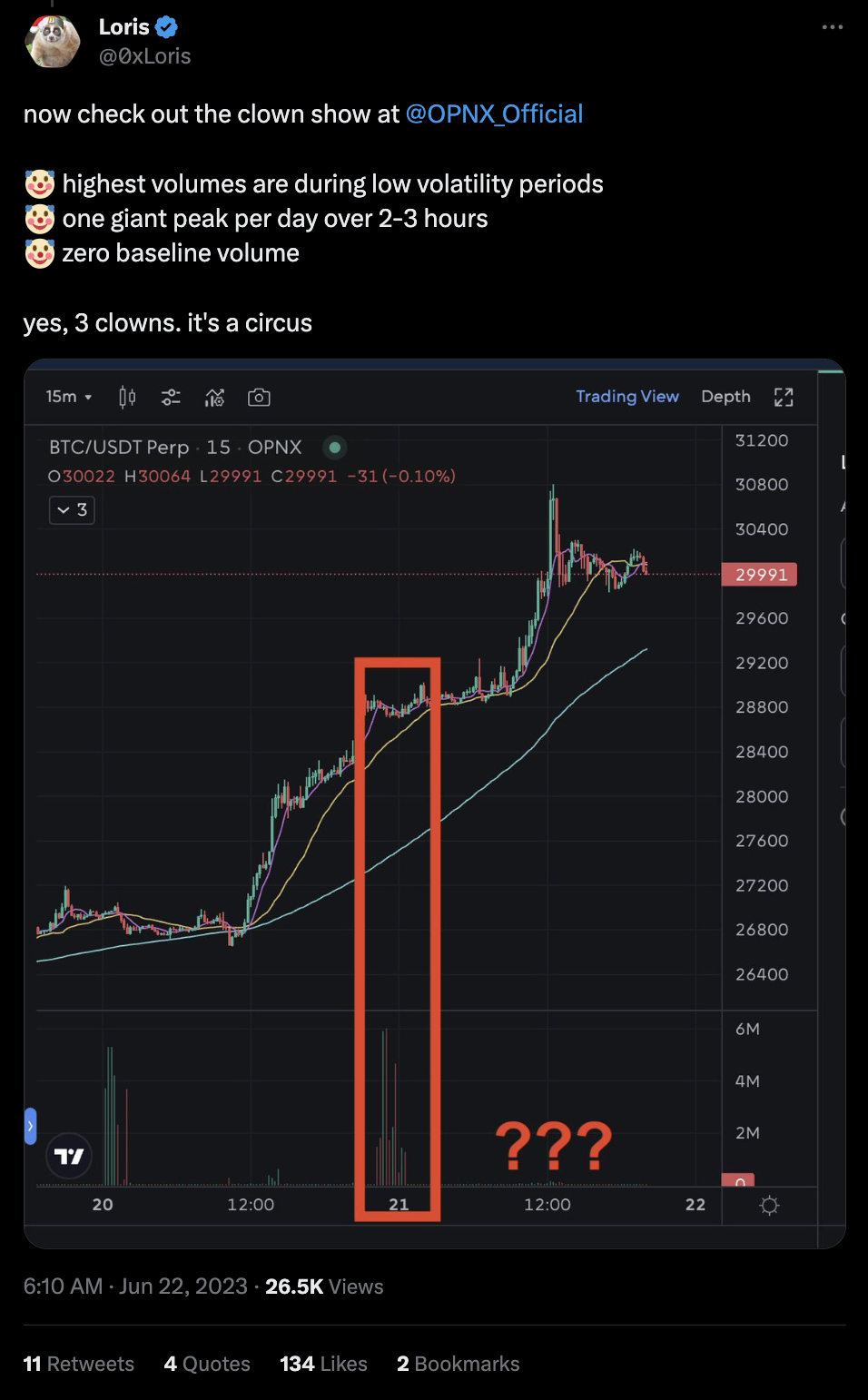 Nhưng ngược lại, Loris nhấn mạnh một số điều đáng ngờ xuất hiện trong khối lượng giao dịch của OPNX, chẳng hạn như khối lượng cao nhất được ghi nhận trong giai đoạn biến động thấp.
