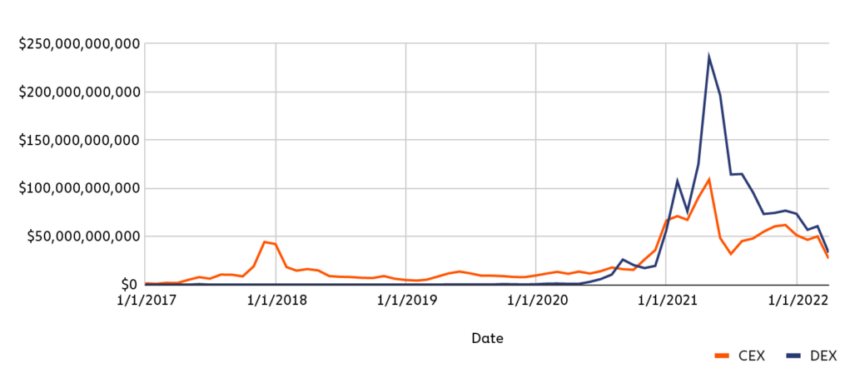 Từ tháng 4 năm 2021 đến tháng 4 năm 2022, DEX đã chứng kiến khối lượng giao dịch trên chuỗi lên tới 224 tỷ USD và CEX là 175 tỷ USD. DEX lần đầu tiên đánh bại CEX trên khối lượng này trong chuỗi 15 tháng. Đây cũng là một dấu hiệu cho thấy sàn DEX hiện đang trở thành cách giao dịch phổ biến nhất.