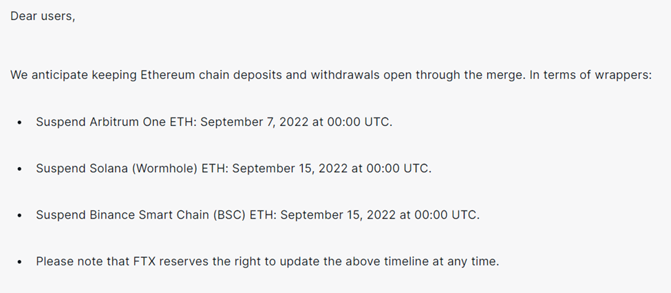 Sàn giao dịch FTX đã thông báo sẽ vẫn cho phép giao dịch ETH khi The Merge diễn ra nhưng sẽ tạm ngưng trên 3 chuỗi có trình Wrapper và Layer 2 là Arbitrum, Solana và Binance Smart Chain. Thời gian tạm ngưng các giao dịch gửi và rút với ETH diễn ra từ ngày 06/9.