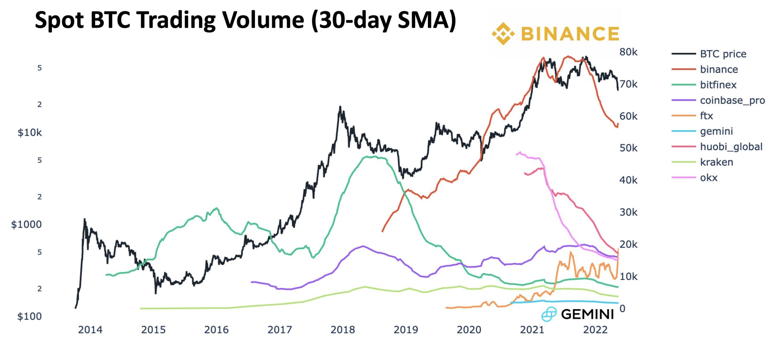 Nếu xét riêng về tổng khối lượng spot của Bitcoin, thì Binance bỏ xa mọi đối thủ hiện tại.