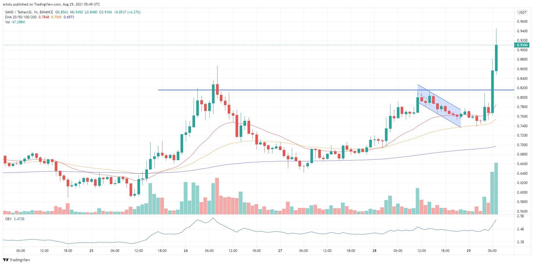 Một sự bứt phá mạnh mẽ được xác nhận bởi khối lượng và các chỉ báo kỹ thuật cho thấy tín hiệu giá SAND có thể sẽ tiếp tục tăng trong những ngày tới. Nhà giao dịch tiền điện tử @hey_shortman đã phân tích biểu đồ của SAND và cho thấy biểu đồ giá SAND đã tạo ra mô hình cốc và tay cầm.