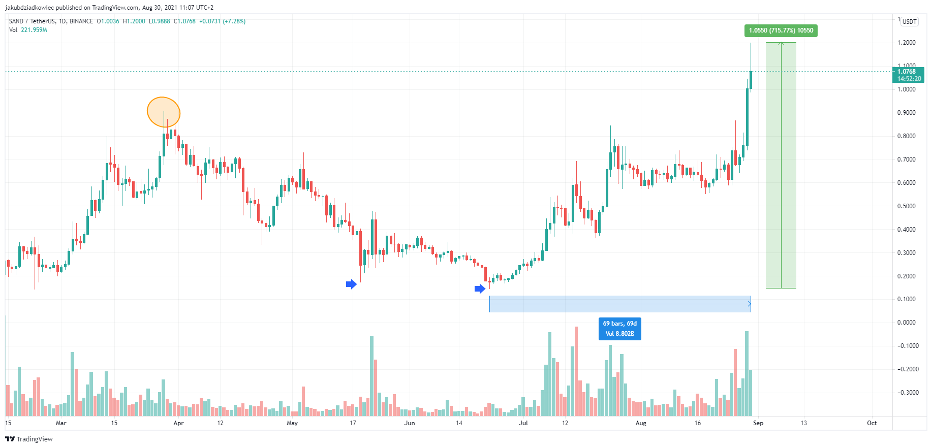 Kể từ đó, biểu đồ giá SAND đã hình thành mô hình tăng giá hai đáy (mũi tên màu xanh. Giá SAND đã bước vào xu hướng tăng trở lại. SAND đã tiếp cận mức đỉnh cũ một lần nữa vào ngày 24 tháng 7. Nhưng xung lực không đủ mạnh nên chỉ đạt tới mức cao 0.85 đô la. Một lần nữa SAND đã trải qua sự điều chỉnh 34% sau đợt tăng giá đó.