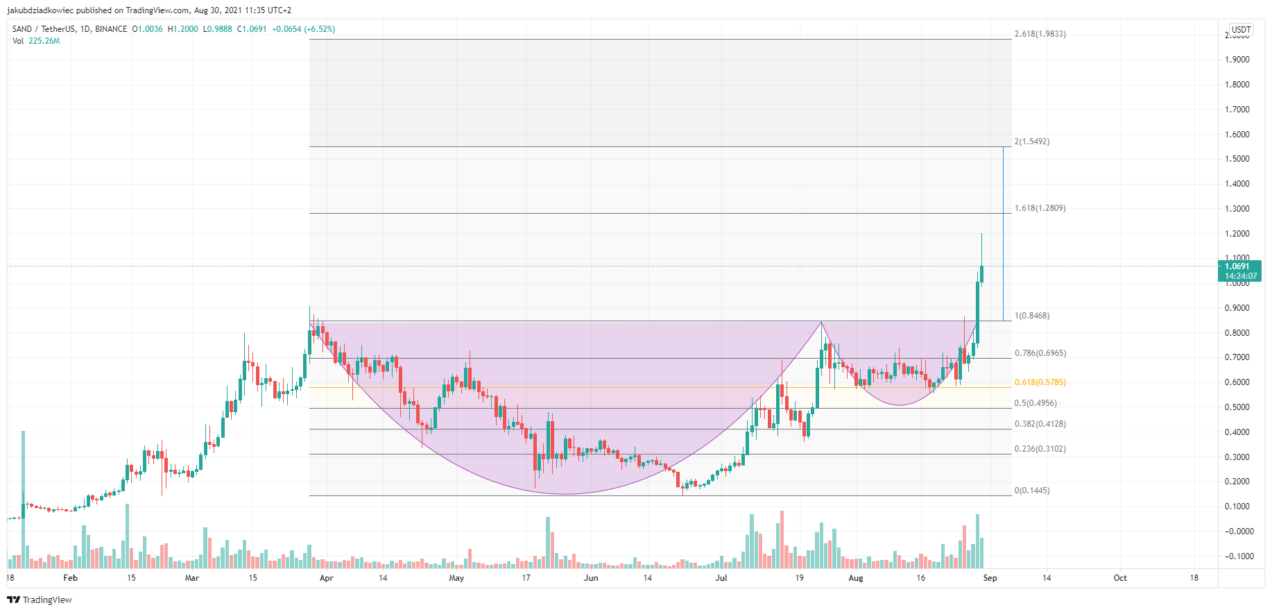 Mục tiêu giá của SAND trong mô hình này là 1.55 đô la. Mục tiêu này được xác định bằng phép chiếu 1: 1 về chiều cao của chiếc cốc (đường màu xanh lam). Mục tiêu này trùng với mức 2 Fib thoái lui bên ngoài và có thể đại diện cho đỉnh của xu hướng tăng hiện tại.