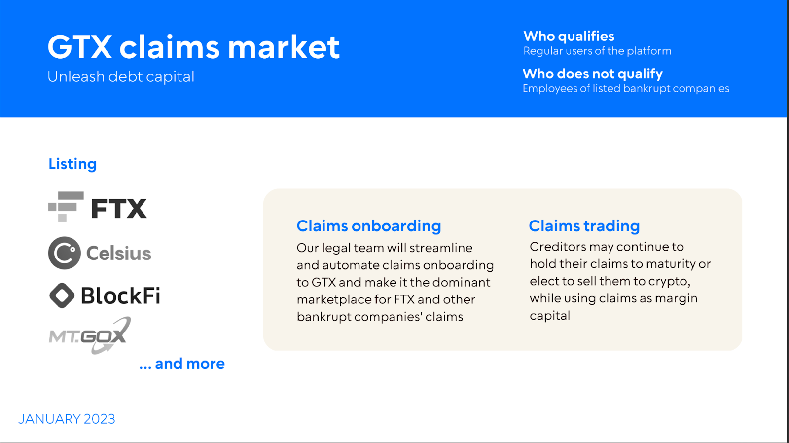 Theo bản thuyết trình, nhóm sáng lập sàn giao dịch GTX tuyên bố rằng mảng tài sản Crypto trong tranh chấp phá sản hiện đang có định giá lên đến 20 tỷ USD. Họ muốn cung cấp tính thanh khoản cho những người có nhu cầu bằng cách cho phép họ “bán chúng lấy tiền điện tử và sử dụng các tài sản tranh chấp làm vốn ký quỹ”.