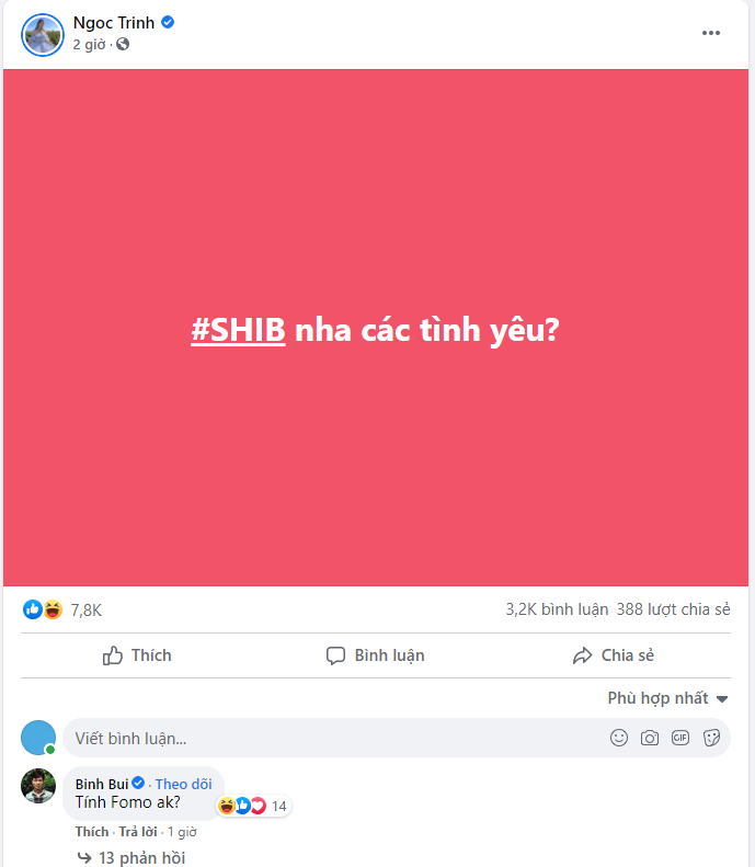 Một nhân vật khác còn “cao tay hơn” đó là người mẫu Ngọc Trinh. Mới đây, cô đã đăng hình chụp tài khoản ví lưu trữ 10 triệu USD nhưng đã vội xoá ít lâu sau đó. Khối tài sản này tương đương 230 tỷ VND, gần 187 Bitcoin theo giá tham chiếu hiện nay. Ngọc Trinh cũng cho hay cô đang nắm giữ SHIB.