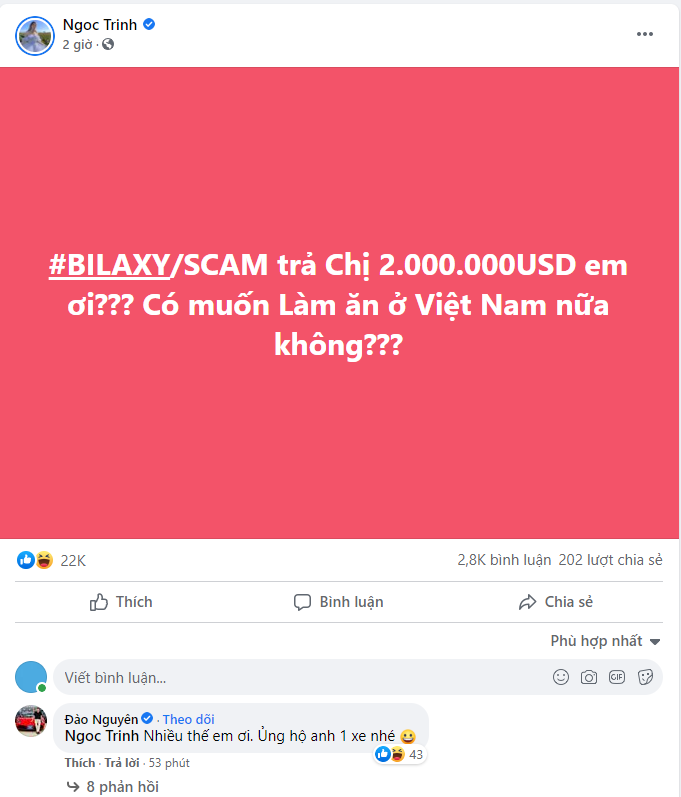 Mới đây, Ngọc Trinh vừa đăng tải một dòng trạng thái về việc bị dính scam. Cụ thể, cô đã mất trắng 2 triệu USD ( tương đương khoảng 46 tỷ VND) bởi sàn Bilaxy. Trước đó, một vài phương tiện thông tin đã cảnh báo nguy cơ lừa đảo của sàn Bilaxy.