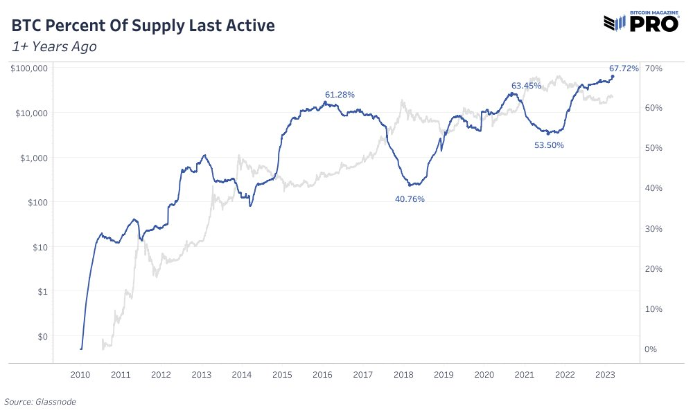 Quan sát biểu đồ biến động tỷ trọng nguồn cung Bitcoin hoạt động lần cuối cách đây 1 năm, sẽ thấy tỷ lệ này lập ATH tại 67.72% vào tháng 3 này.