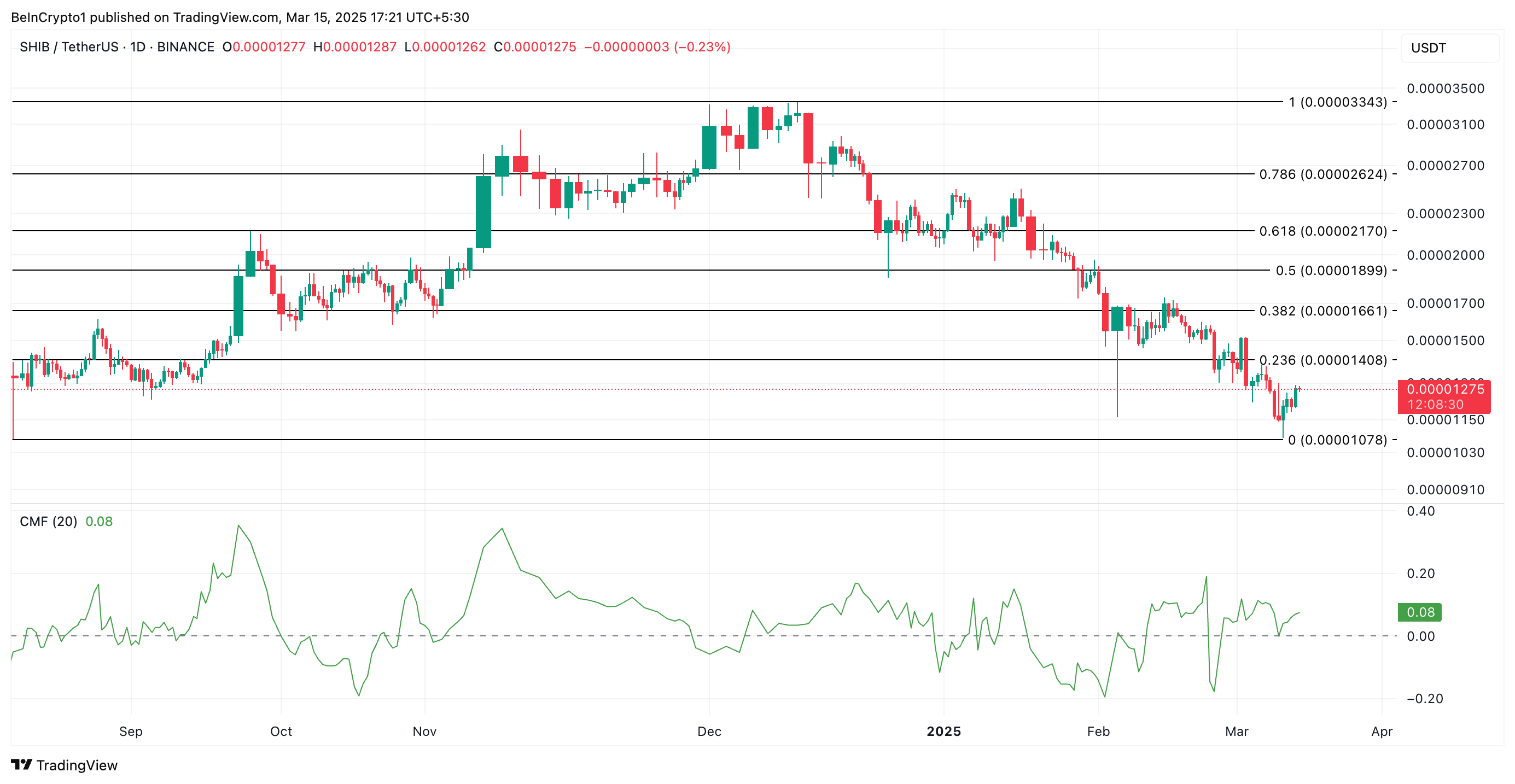 Trên biểu đồ hàng ngày, chỉ số Chaikin Money Flow (CMF) tích cực của SHIB hỗ trợ triển vọng tăng giá ở trên. Tại thời điểm viết bài, chỉ số động lượng này đang ở mức 0.08 và đang có xu hướng tăng.