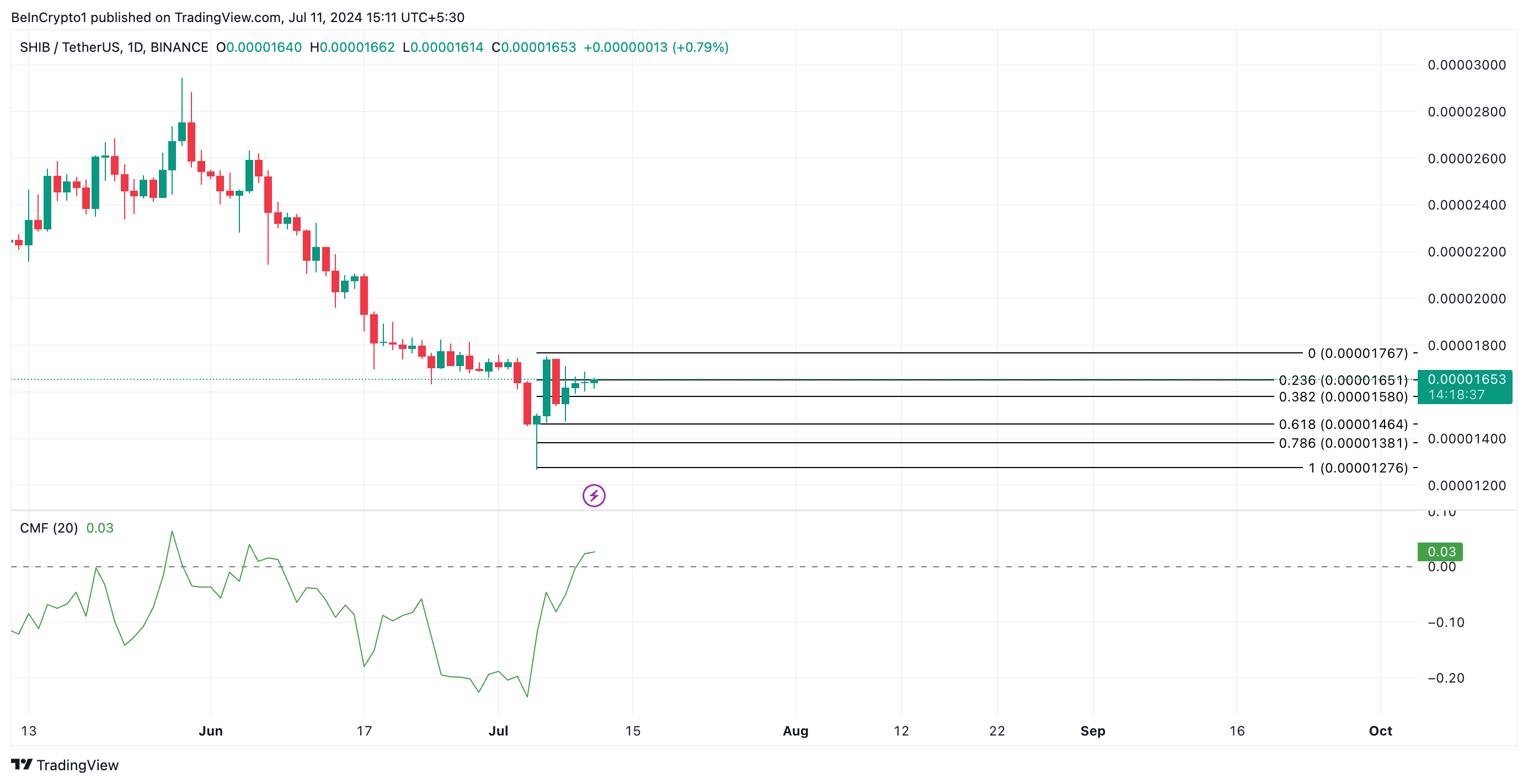 Khi giá của một tài sản tăng cùng với chỉ số CMF của nó, điều này thường báo hiệu áp lực mua mạnh và động lực tích cực. Khối lượng giao dịch lớn hỗ trợ cho sự tăng giá, cho thấy rằng sự tăng giá này có khả năng bền vững hơn. Nếu xu hướng này tiếp tục, giá của SHIB có thể tăng lên mức 0.00001767 USD.