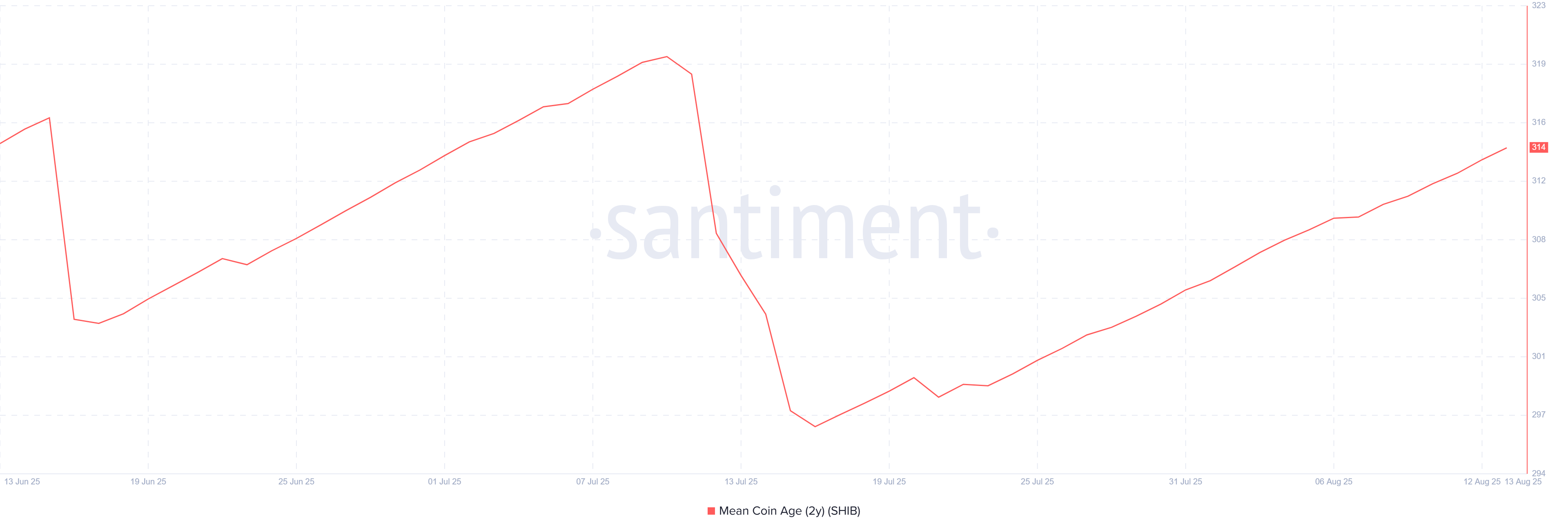 Chỉ số Tuổi Trung bình Coin 2 Năm, theo dõi sự di chuyển của token trong hai năm qua, cho thấy sự gia tăng. Trong hai tháng qua, chỉ có một trường hợp bán ra được ghi nhận, nhấn mạnh sự kiên trì của những người nắm giữ dài hạn SHIB.