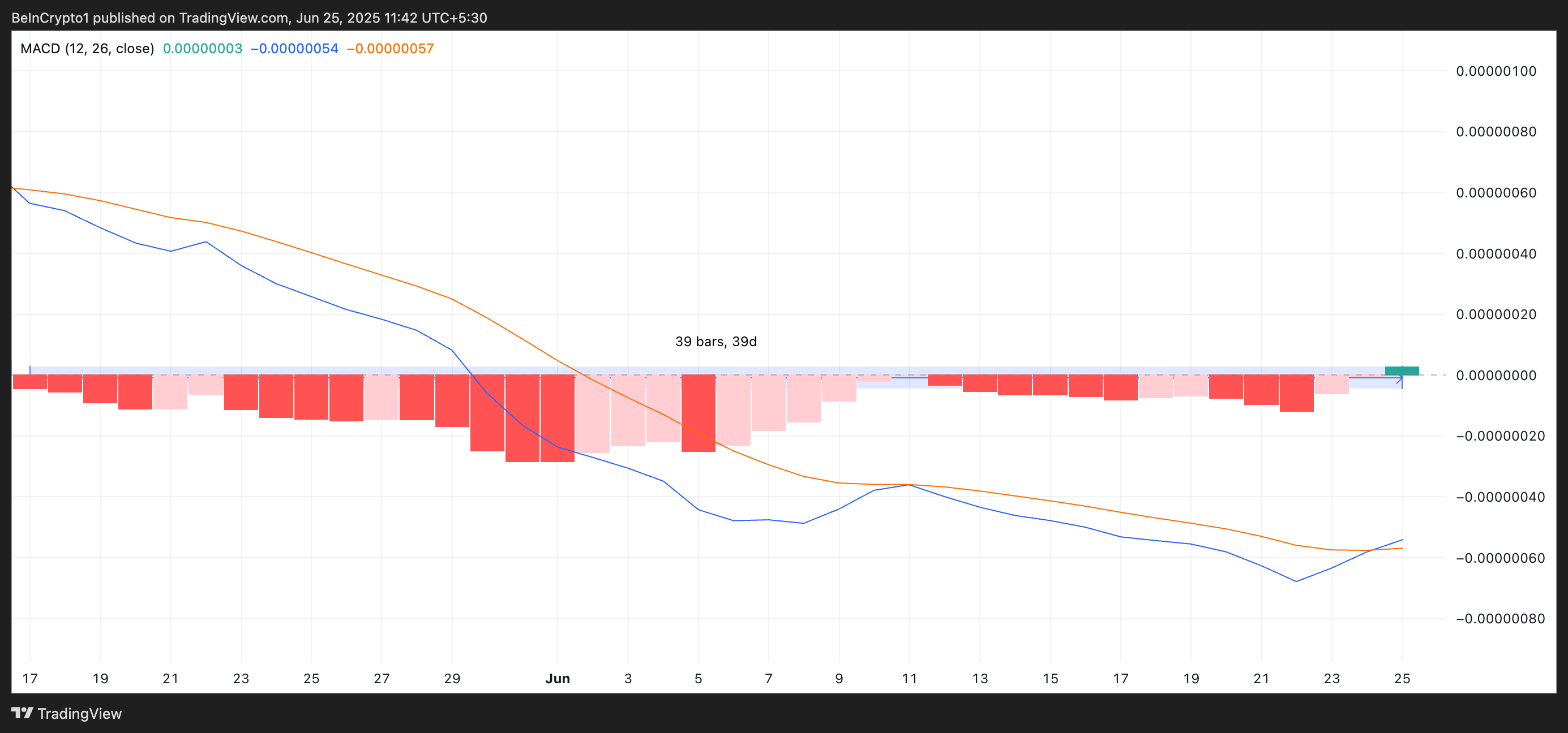 Đáng chú ý nhất, chỉ báo Moving Average Convergence Divergence (MACD) của token vừa phát ra tín hiệu giao cắt tăng giá đầu tiên thành công trong 39 ngày, báo hiệu động lực đang cải thiện. Các chỉ số từ chỉ báo cho thấy đường MACD (màu xanh) nằm trên đường tín hiệu (màu cam) lần đầu tiên trong hơn một tháng.