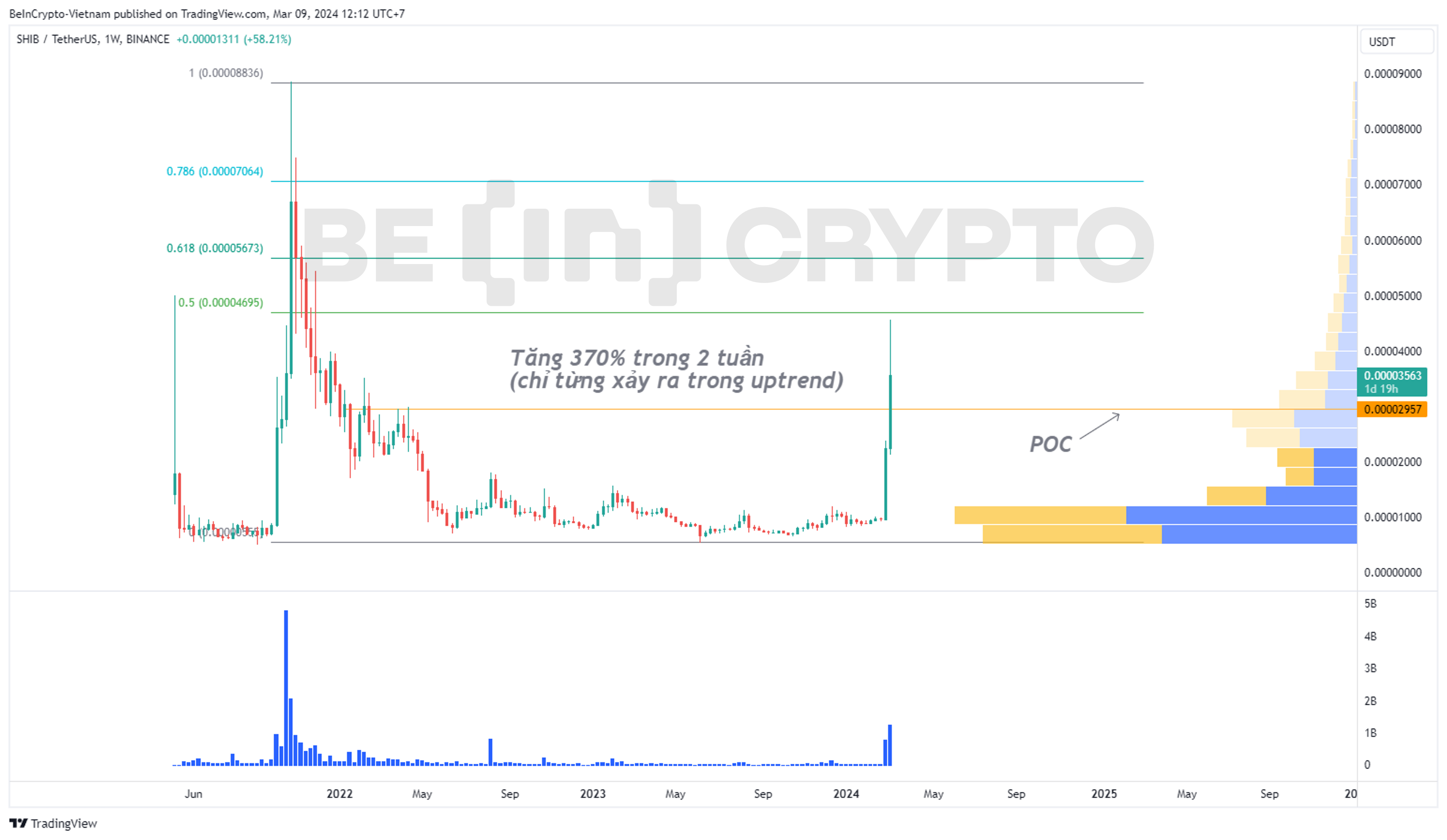 - Cơ hội mua lại SHIB nằm tại hỗ trợ 0.000030 USD, đây là vùng Point-of-Control (POC) gần nhất, là vùng có thanh khoản lớn thứ nhì chỉ sau vùng giá tích lũy. Kỳ vọng bắt đáy có thể rất mạnh mẽ tại đây. Cơ hội để chốt lời SHIB trong ngắn hạn nằm tại mức fibo 0.5 và fibo tỷ lệ vàng 0.618, tương đương mức giá 0.000045 USD và 0.000055 USD.