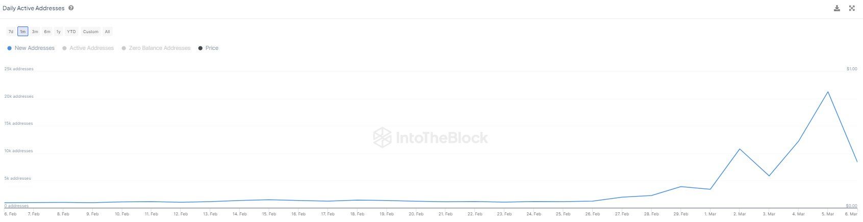 - Dữ liệu IntoTheBlock cho biết lượng địa chỉ ví mới của SHIB mỗi ngày đã lập mức cao trong tháng 3, có ngày đạt hơn 21,000 địa chỉ mới. Biểu đồ cho thấy lượng địa chỉ mới đã có dấu hiệu tăng ngày đầu tháng 3, và đến nay đã tăng gấp 20 lần mức trung bình của tháng trước.