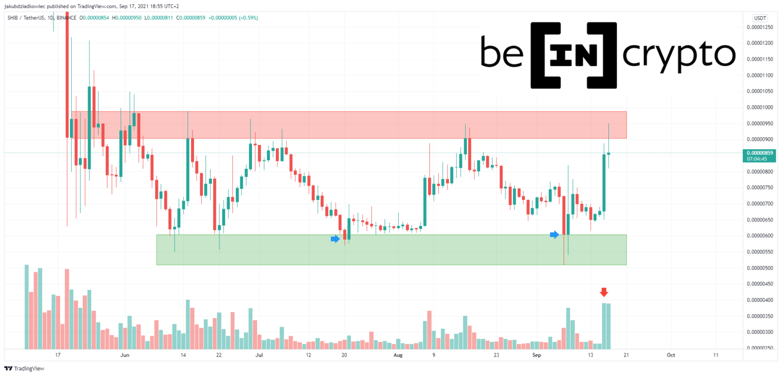 Kể từ khi giảm tháng 5 năm 2021, SHIB đã nằm trong phạm vi giữa mức kháng cự từ $0.00000950 (hình chữ nhật màu đỏ) đến mức hỗ trợ $0.00000550 (hình chữ nhật màu xanh lá cây). Trong khoảng thời gian gần 4 tháng, đồng Altcoin này đã liên tục vươn lên và bật lên khỏi hai mức này.