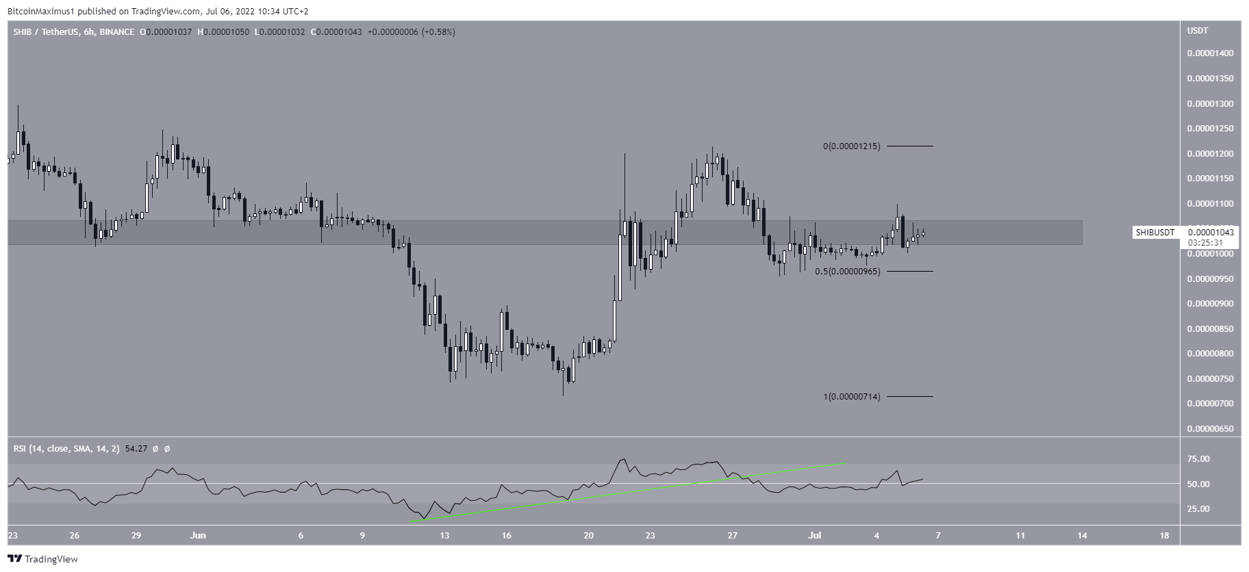 Trong biểu đồ giá SHIB 6 giờ, đã có sự xuất hiện của phân kỳ tăng trong chỉ số RSI khi giá SHIB bật tăng trở lại từ đáy. Tuy nhiên, đường xu hướng của sự phân kỳ đã bị phá vỡ. Chỉ báo RSI hiện đang ở ngay đường 50, được coi là chỉ số trung lập.