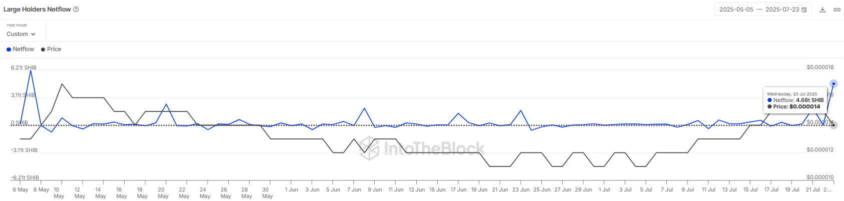 Dòng tiền ròng của các nhà đầu tư lớn đối với Shiba Inu gần đây đã tăng vọt, đạt mức cao nhất trong hai tháng. Trong 24 giờ qua, 4.66 nghìn tỷ SHIB đã được tích lũy bởi các địa chỉ nắm giữ ít nhất 0.1% nguồn cung lưu hành. Những cá voi này, đã đầu tư tổng cộng 63.7 triệu USD, đang đặt cược vào sự phục hồi giá.