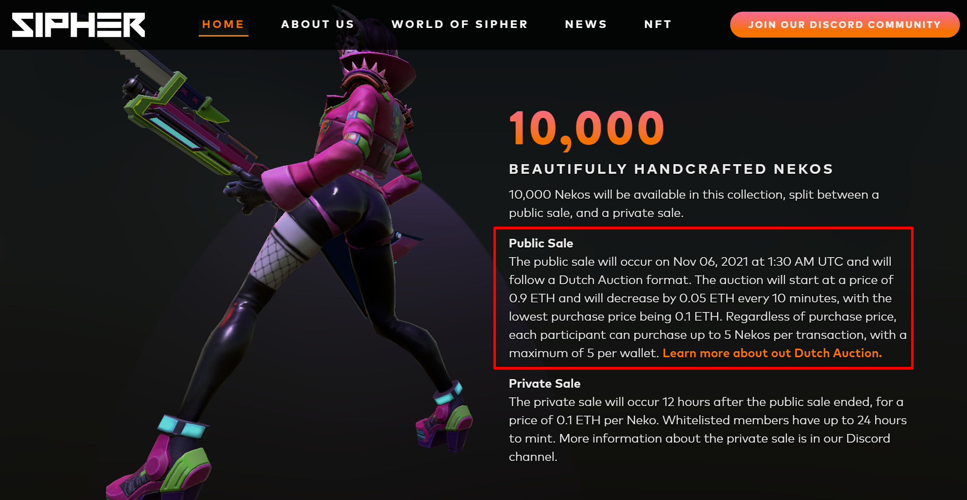 Chương trình public sale NEKO sẽ diễn ra vào lúc 8:30am ngày 06/11/2021. Để tham gia, mỗi ví mua được tối đa là 5 NFTs NEKO. Cần lưu ý, Public sale hoạt động theo cơ chế Dutch Auction format (tạm dịch Đấu giá ngược kiểu Hà Lan). Nghĩa là, mỗi NFT sẽ bắt đầu rao bán với giá 0.9 ETH và đếm ngược sau mỗi 10 phút sẽ giảm 0.05 ETH. Mức giá tối thiểu được bán là 0.1 ETH. Với hình thức mua này, có thể thấy SIPHER đang muốn bảo vệ người mua khỏi gas war.