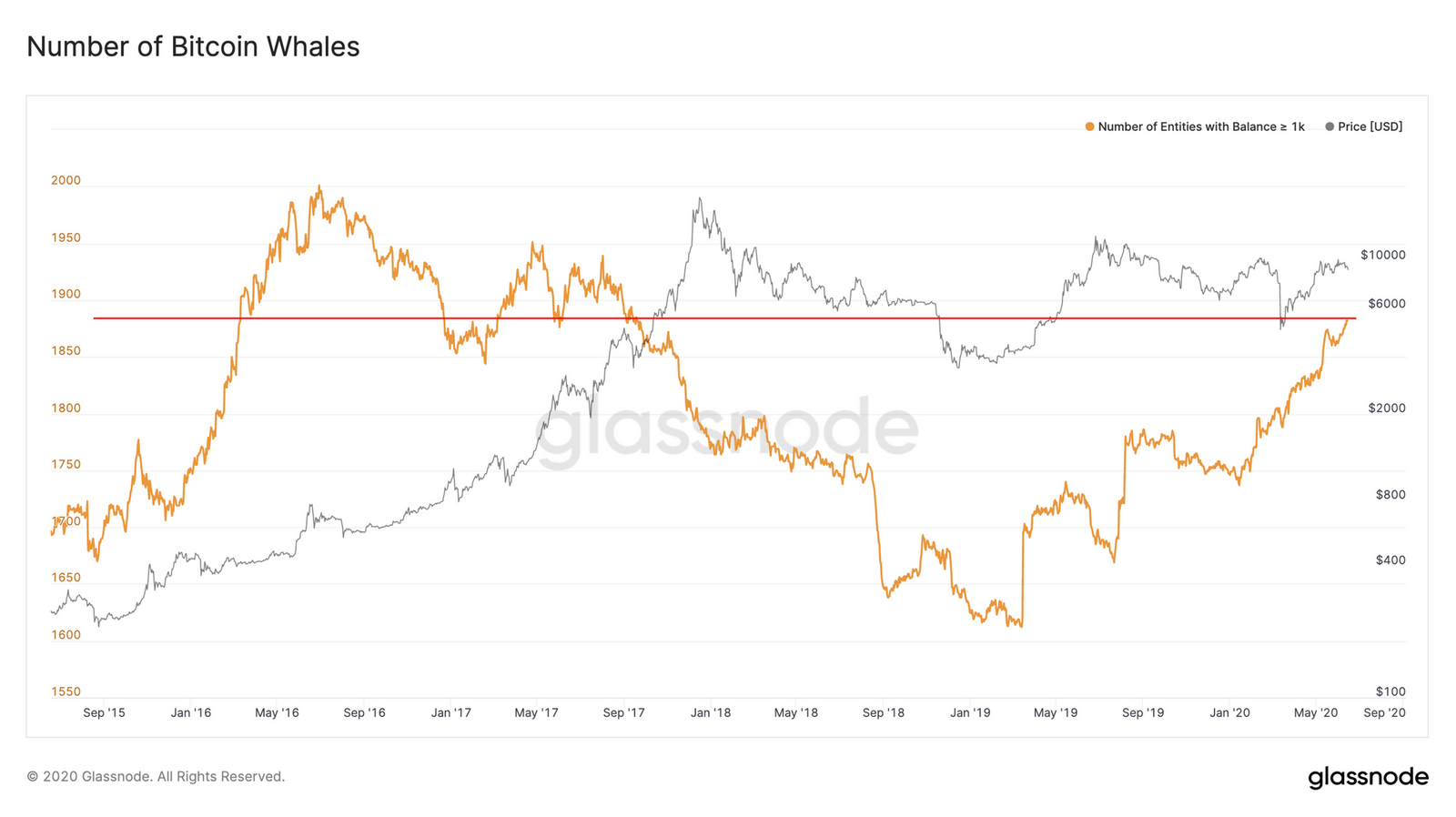 Công ty phân tích blockchain Glassnode gần đây cho biết, số lượng các cá voi tiếp tục tăng trưởng. Số lượng các nhà giao dịch nắm giữ 1.000 BTC (khoảng 9,53 triệu USD) hoặc nhiều hơn gần như tăng trưởng liên tục kể từ tháng 1 của năm nay. Bất chấp đổ vỡ của thị trường vào giữa tháng 3 năm nay.