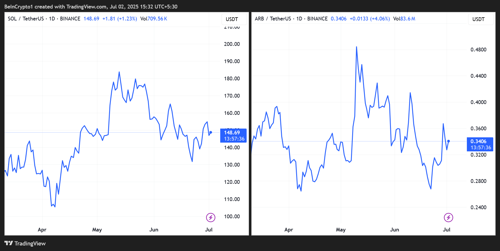 Mặc dù có những chất xúc tác lớn như Solana tiến gần hơn đến việc ra mắt ETF (quỹ giao dịch trao đổi) staking, và Robinhood tích hợp Arbitrum, cả hai altcoin SOL và ARB hầu như không có biến động.